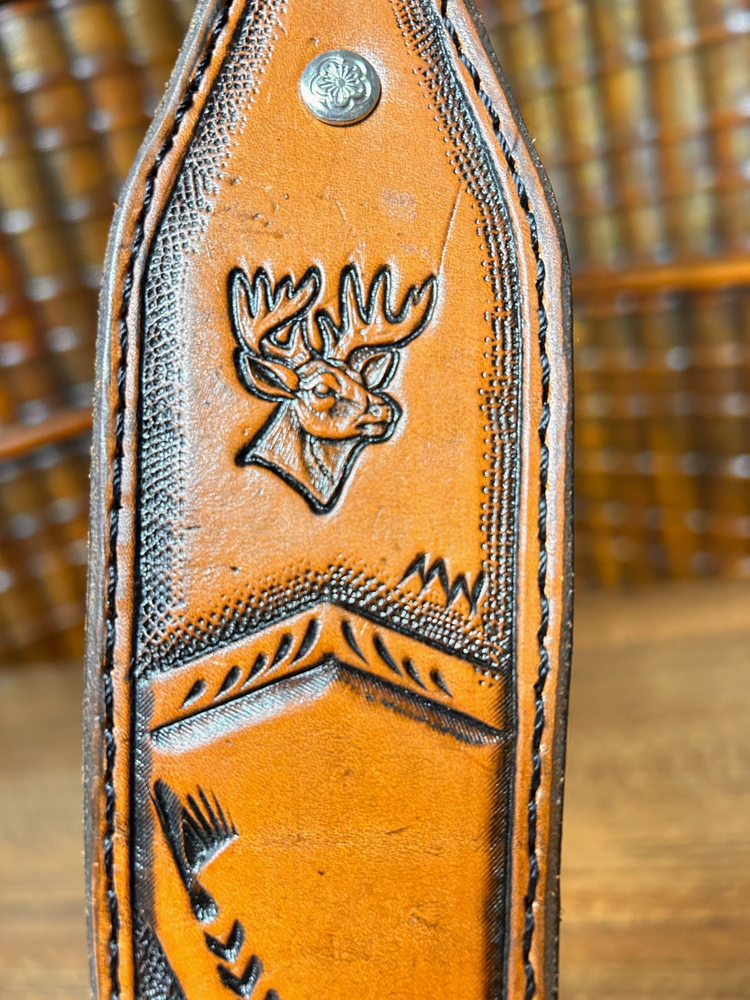 Rifle Sling, Leather (brown with black design, and stitching) Hand Tooled (Prison Made) Western Design with Deer, Adjustable Note there is no damage to the leather around the deer's face, that is glare from my overhead lights. New. Measures 38 inches, adjustable from 27 to 40 inches (40 would require taking the loop and brad out to extend, the holes are present, would just have to unscrew the brads) Leather backed, soft tan leather. Made by a Lifer at Cummins Prison, Arkansas All proceeds return to him.