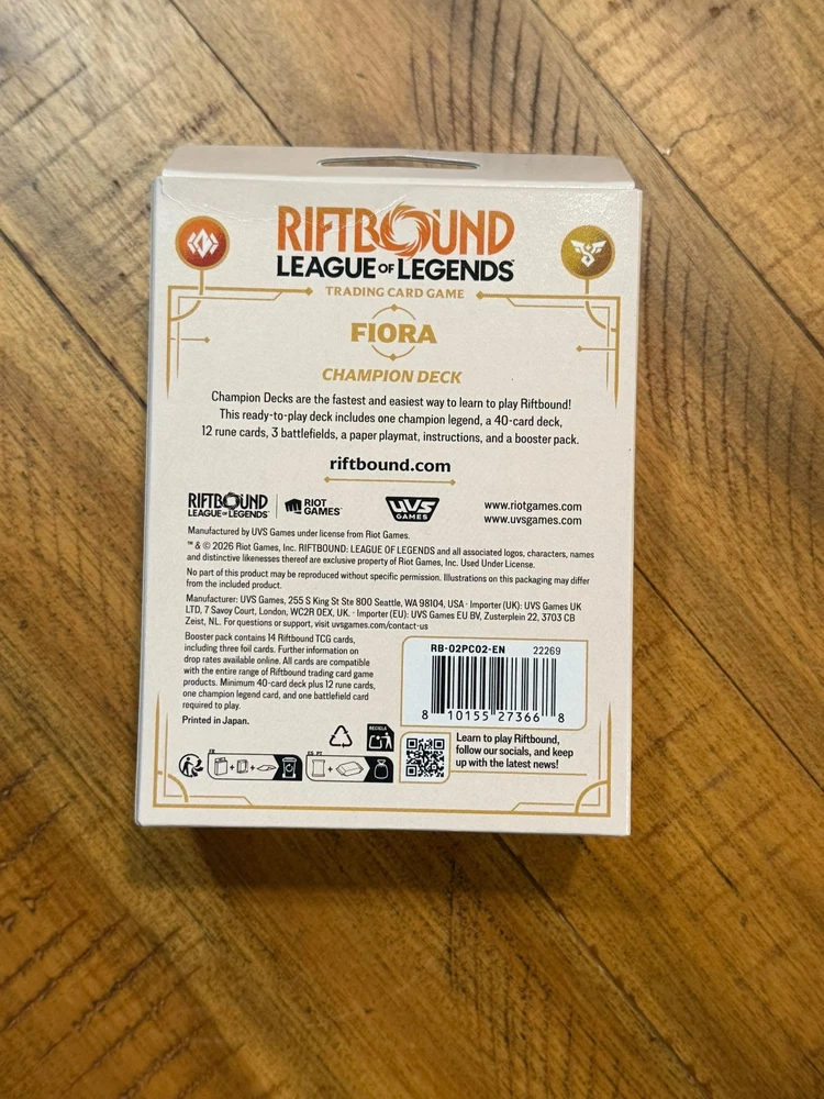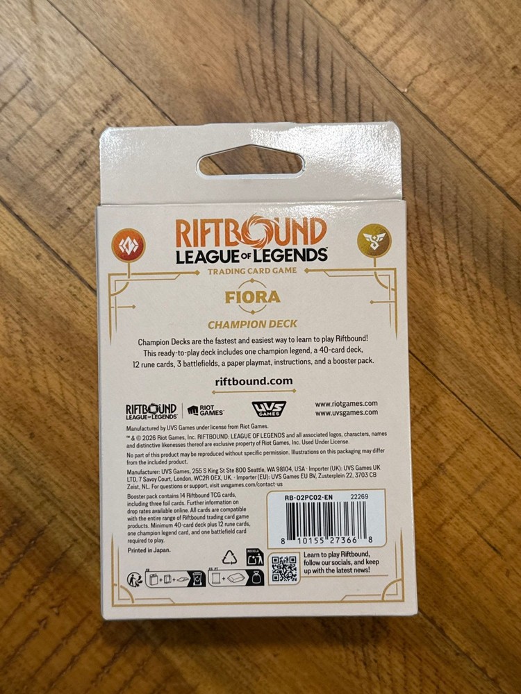 Country of Origin: United States Game: Riftbound Year Manufactured: 2026 UPC: 810155273668 Set: Fiora Language: English Number of Decks or Kits: 1 Configuration: Deck Age Level: 13+ gtin13: 810155273668 Features: Booster, Starter Deck, Champion Legend, Paper Playmat Character: Fiora, Rumble