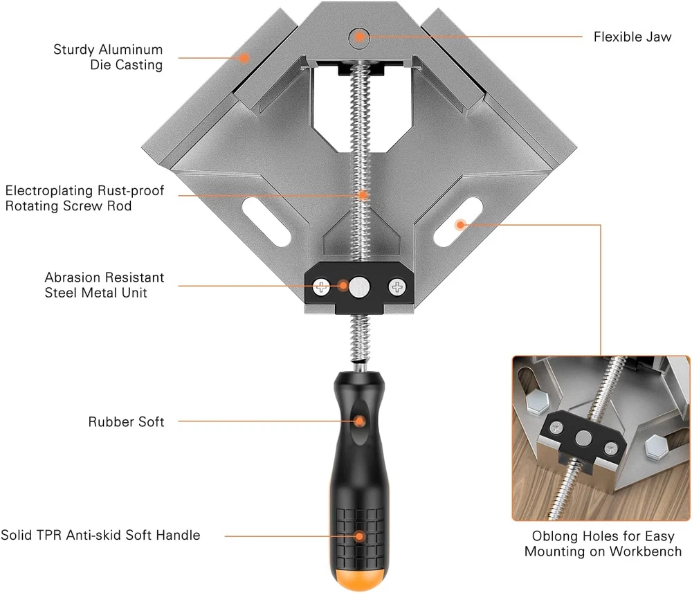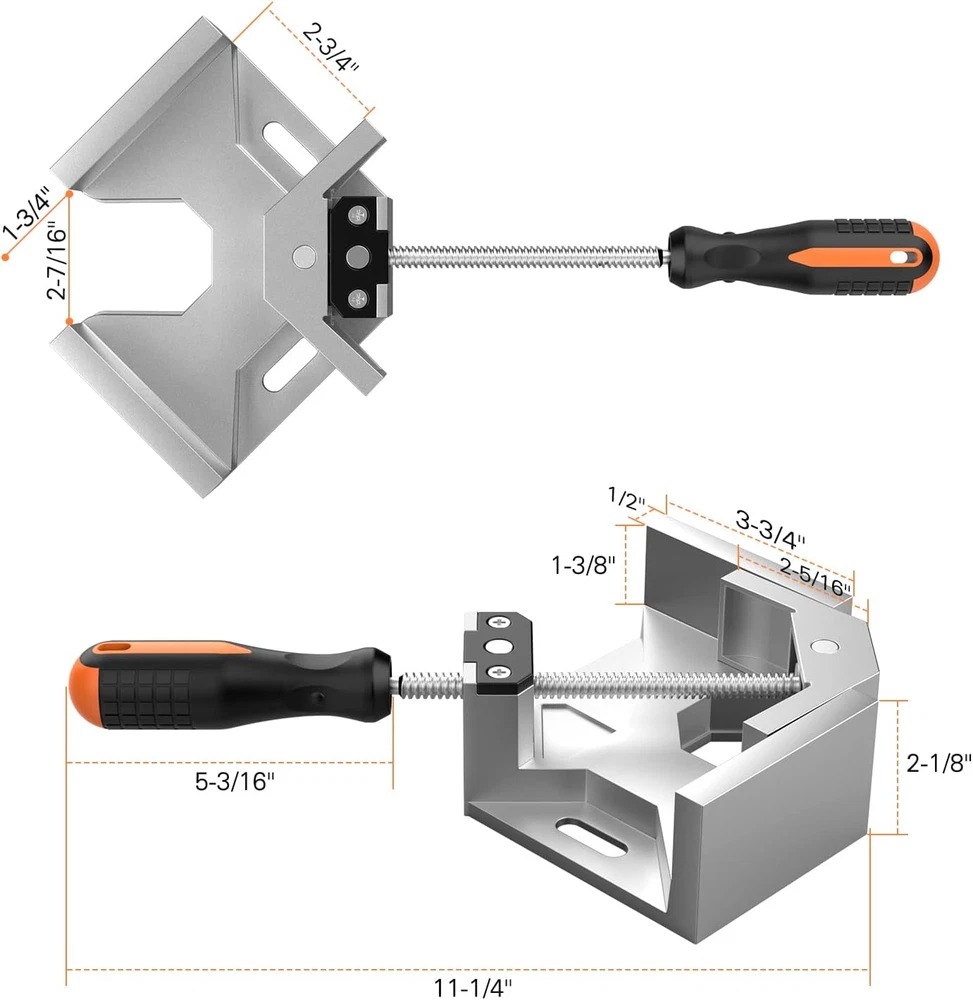【Premium Quality Clamps for Woodworking】: Woodworking gifts for men. Sturdy 90 degree wood corner clamps, made of premium aluminum alloy die-casting material with heat treated rust proof coating, ensure abrasion-resistant, heavy-duty, and long-lasting use. 【70mm Clamping Range】: Maximum clamping range is approx. 2.75in/70mm; jaw width: 3.74in/95mm; jaw depth: 1.4in/35mm. It can accommodate metal tubes, steel rods, wood, thick glass, acrylic pieces, and more. It is wood working tools and equipment commonly used in daily life as cabinet clamps, etc. Corner clamps for woodworking are a great tool to make woodworking projects easier. 【Adjustable Swing Jaw Design】: The single-handle jaw of the Corner Clamps for Woodworking can be rotated in two-way, which allows two different thicknesses of rods or blocks to be joined at an angle of 90 degree. The design will fix your work pieces precisely. 【Ergonomic TPR Coated Handle】: Clamps for woodworking have rubber handles. Rubberized single handle offers a comfortable grip and prevents slip. Solid and anti-skid, helps to set up instantly and secure quickly. 【Versatile Use】: Housolution clamps for woodworking jig is perfect for aligning, nailing, drilling, woodworking, welding, screwing, making cabinets, assembling furniture, furniture repair connection, building wooden boxes, picture frames, birdhouse, mailbox, DIY woodworking, and dresser drawers, etc.Gifts for Men, wood worker gifts, woodworking gifts, tool gifts. Product Description Whether you are a DIY woodworker or a professional, a corner clamp is a go-to tool. Housolution Single Handle 90° Aluminum Alloy Corner Clamp is just the one that you are looking for. Easy to Use! Great for framing, drilling, doweling, and much more. Ergonomic Design The anti-slip handle is covered with TPR coating to ensure your hands are comfortable to use. Whether it's for professional use or DIY use, Housolution 90-degree right angle clamp is your perfect choice. Rotary Jaw The single-handle jaw of the right angle clamp can rotate in two-way, making clamping more convenient and clamping the workpiece more accurate. It can allow two wood block of different thicknesses to be jointed at a 90° angle. Jaw Opening: 68mm/2.68"J Jaw Width: 95mm/3.74"J Jaw Depth: 35mm/1.38" Perfect For All Materials An ideal gift for professionals This single handle 90° aluminum alloy corner clamp is a great value for home DIYers. It is a good choice for aligning, nailing, woodworking, welding, screwing, making cabinets, box, and picture frames, and can be set up nearly instantaneously. Body Material: Aluminum Alloy Single Handle: Adjustable handle jaw rotation Item Weight: 28.75oz Package: 1 x 90° Right Angle Clamp The video showcases the product in use. The video guides you through product setup. The video compares multiple products. The video shows the product being unpacked. hero-video Merchant Video Choose for other tools Add to Cart Add to Cart Add to Cart Customer Reviews 4.4 out of 5 stars 4,740 4.5 out of 5 stars 115 4.3 out of 5 stars 149 4.0 out of 5 stars 875 4.4 out of 5 stars 3,350 4.6 out of 5 stars 725 4.3 out of 5 stars 102 Price — — $27.99 $ 27 . 99 — $26.99 $ 26 . 99 $16.99 $ 16 . 99 — Material Aluminum Alloy Construction Premium ABS Aluminum Alloy High-carbon Steel Cast Steel Stainless Steel Iron Maximum Clamping Range 2.68in/68mm - 3.7in/95mm 3 Different Sizes 3 inch/77.5mm 0-6inch/0-150mm - Jaw Width 95mm/3.74 inch - - - 2.75 inch/70mm - - Item Weight 28.75oz/815g 18oz/500g 7.41oz/210g 48.82oz/1384g 56.09oz/1590g 7.05oz/200g - Easy to Use ✔ ✔ ✔ ✔ ✔ ✔ ✔ Multiple Color Options √ √ √ - √ - - Feature Rubberized Handle, Swing Jaw Accurate, Multi-modes, Bright Upgrade Clamp, Wide & Thick Swivel Pad, Comfortable Handle 360° Swivel, Lenghened Throat ABS Setting, 4 Measurements High Load-bearing Capacity Application Aligning, nailing, woodworking Aligning, indoor/outdoor use Aligning, nailing, woodworking Woodworking, aligning, nailing Woodworking, cutting conduit Professionals, carpenters Orderly store power tools