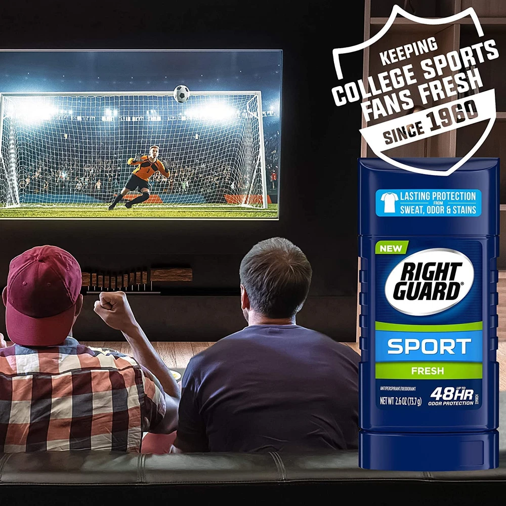 Product Description When we make Right Guard brand, we don't fool around, at least around the beakers and flammables. Science! In fact, we‰۪re totally committed to destroying embarrassing odor and wetness. This is more than a list of ingredients. It‰۪s total confidence in how you look, smell and feel. You know that guy in the stands that is confident enough to start the wave even when your team is down by 30 that could be you. With up to 48-hours of sweat, odor, and stain protection, Right Guard Sport has you protected. So, go ahead and throw your arms in the air. Lasting protection: right guard sport deodorant with lasting protection from odor for up to 48 hours Won’t stain or discolor clothes: a men’s deodorant that defends against yellow stains on clothing High performance formula: dermatologist tested, non-greasy, and non-sticky Free from: this deodorant was designed to be free from aluminum, alcohol, talc and parabens. Fragrance: range of crisp, fresh scents that keep you feeling refreshed with Range of crisp, fresh scents that keep you feeling refreshed All day protection: provides long-lasting protection from sweat and odor Dermatologist-tested formula Right guard deodorant sticks. Country of origin is united states Defends against yellow stains on clothing Dermatologist tested formula Sweat blockers Odor lockers Fresh scent Ingredients Cyclomethicone, Stearyl Alcohol, PPG-14 Butyl Ether, Ceteareth-30, PEG-40 Hydrogenated Castor Oil, Cetyl Alcohol, Myristyl Myristate, Parfum (Fragrance), Polyethylene, Hydrogenated Castor Oil, Aluminum Starch Octenylsuccinate, Ricinus Communis (Castor) Seed Oil, Arachidyl Alcohol, Myristyl Alcohol, Benzyl Salicylate, Linalool, Benzyl Alcohol, Coumarin, Citronellol, Butylphenyl Methylpropional