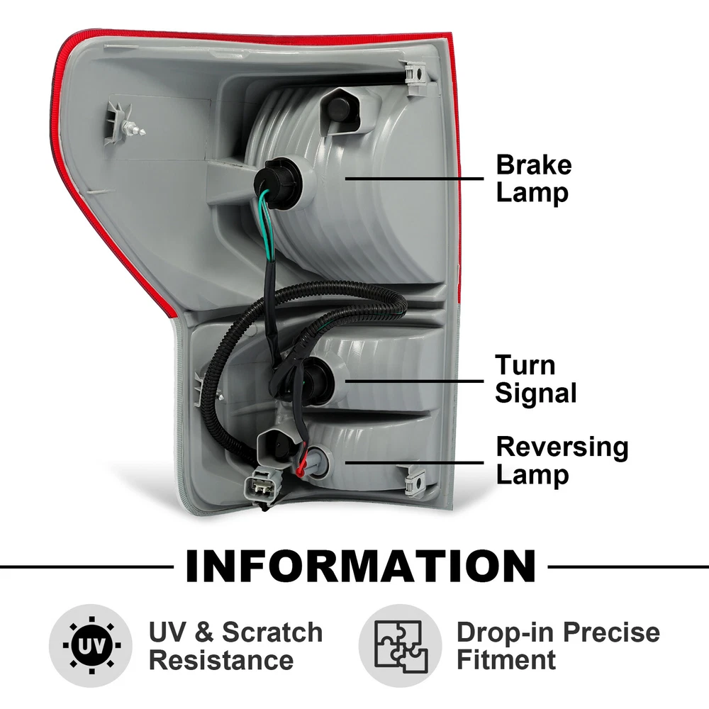 Store Categories Store Categories For Ford For Chevrolet For Dodge For Toyota For Honda Other Details For Toyota Tundra Pickup 2007-2013 Tail Brake Light Red Clear Lens Right Side Fitment : For Toyota Tundra 2007-2013 Specification : Condition: 100% Brand New Color: Red Lens+Clear Lens+Chrome Housing Material: Plastic Housing Color: Chrome Lens Color: Red + Clear Placement on Vehicle: Right, Rear Replace for TO2800183, 815600C070, 815600C090 Features: Excellent shock, heat and cold resistance. Anti-UV coating to prevent lenses from yellowing and cracking. UV & heat resistance lens features durability and ensure no flaking and fading . Plug & Play-Easy Installation. No drilling and external wiring required. Package Includes : 1 x Passenger Side Tail Light Shipping: All items will be shipped out in 1 business day, no expedited service available. We ship our items to USA only(Does NOT include Hawaii, Alaska or Puerto Rico, PO Boxes/APO's). Shipping Notes: We use multiple warehouses and will select the nearest warehouse for delivery according to your order address and our inventory, Thank you for your cooperation. Contact us: Any Questions, Just feel free to contact us on eBay. We will reply you in 24 hours. Store Categories Store Categories For Ford For Chevrolet For Dodge For Toyota For Honda Other Details Right Tail Light Brake Lamp w/ Bulb Passenger Side For Toyota Tundra 2007-2013 Fitment For Toyota Tundra 2007-2013 Replace for TO2801183, TO2801165, 815500C090, 81550-0C090 Specification Condition: 100% Brand New Color: Red Lens+Clear Lens+Chrome Housing Material: Plastic Product Specifics: Type: Tail Light Lighting Technology:Halogen Lens Color: Red +Clear Housing Color: Chrome Items Included:Bulbs Included Placement on Vehicle: Rear, Right Installation Method: Screw-On Features: DOT-Certified Feature Designed for effortless installation, our tail light are meticulously engineered to provide an exact and seamless fit for your vehicle. Crafted from superior quality plastic materials, our tail light boasts exceptional durability and resilience against wear and tear. Our tail lights have been rigorously tested to guarantee maximum performance, offering optimal brightness levels and consistent illumination to ensure your safety on the road. Package Included 1 x Passenger Side Tail Light Bulbs Included Shipping All items will be shipped out in 1 business day, no expedited service available. We ship our items to USA only(Does NOT include Hawaii, Alaska or Puerto Rico, PO Boxes/APO's). Shipping Notes We use multiple warehouses and will select the nearest warehouse for delivery according to your order address and our inventory, Thank you for your cooperation. Contact us Any Questions, Just feel free to contact us on eBay. We will reply you in 24 hours. On Jan 19, 2025 at 18:06:35 PST, seller added the following information: