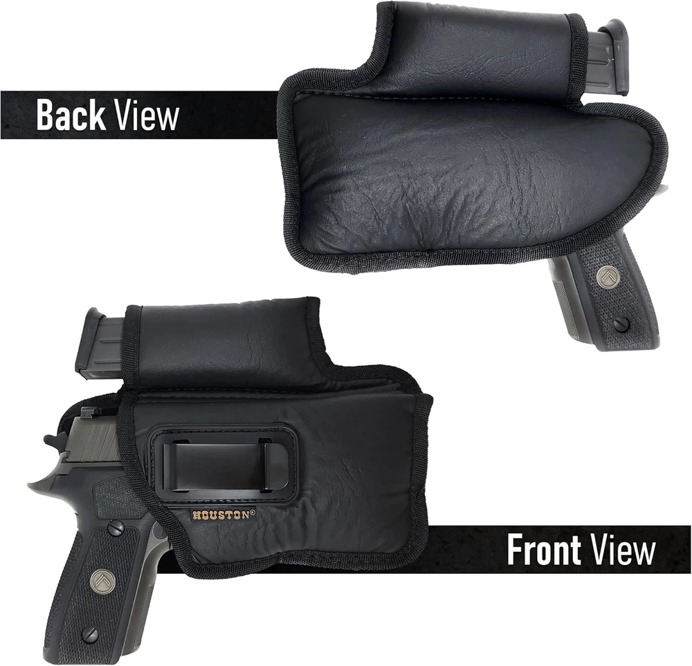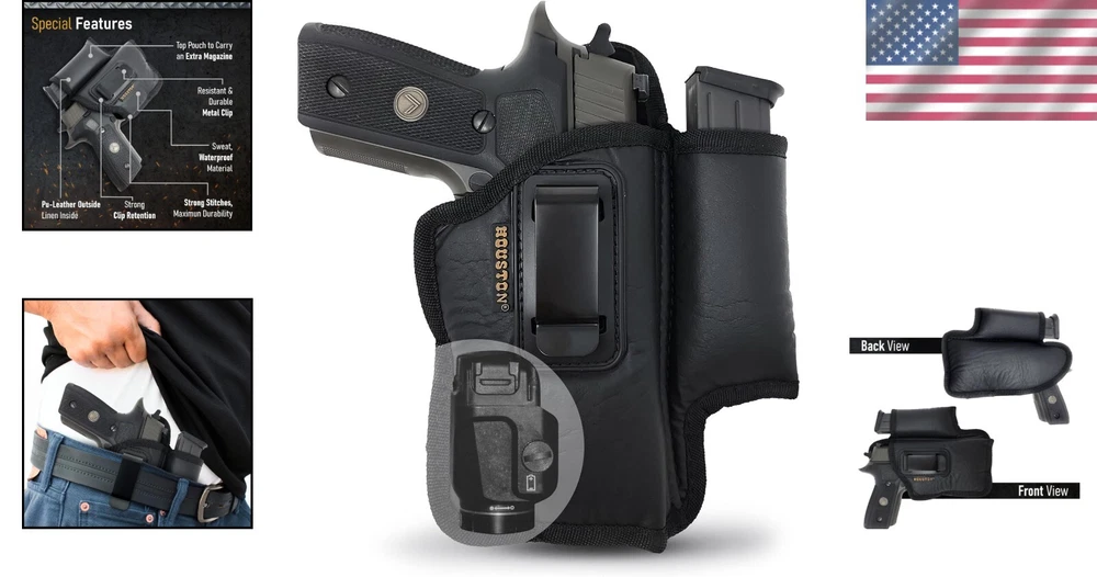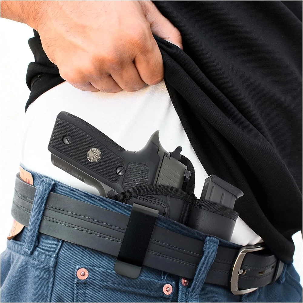 Item Package Dimensions L X W X H: 11.65 X 7.32 X 1.5 Inches UPC: Does not apply Cant: Neutral Carry Position: 3 o'Clock Closure Type: Hook And Loop Features: With Clip, Lightweight, Adjustable Straps, Water Resistant Color: Black Handedness: Right Attachment Type: Clip Package Weight: 0.08 Kilograms Style: Compact Item Weight: 0.08 kg Number of Magazines: 1 Set Includes: Holster with Mag Pouch Level: Level 1 Type: Concealment Holster Material: Faux Leather gtin13: Does not apply Sport/Activity: Shooting Suggested Users: Unisex-adult Global Trade Identification Number: 00810046085981 Gauge/Caliber: .40 S&W, 9mm, .45 ACP Hand Orientation: Right Brand: Unbranded For Gun Make: GLOCK, SIG SAUER, BERETTA, RUGER, H&K, SPRINGFIELD, HI-POINT Carry Location: Inside Waistband (IWB) For Gun Type: Pistol