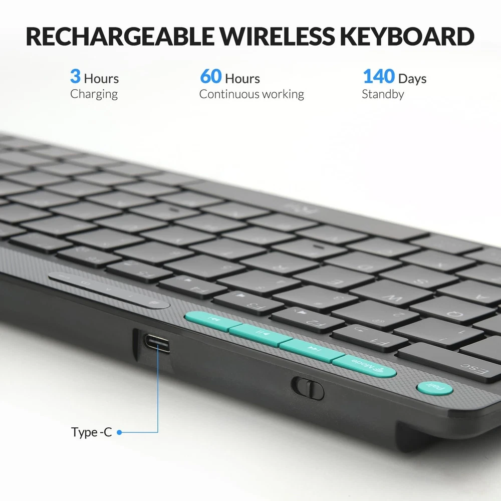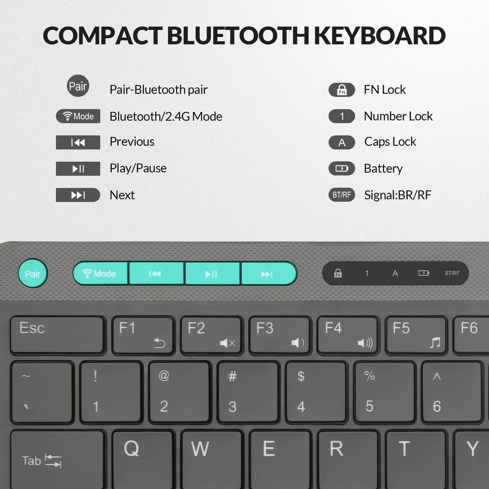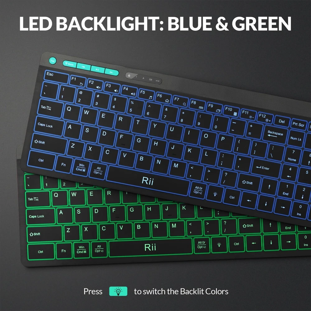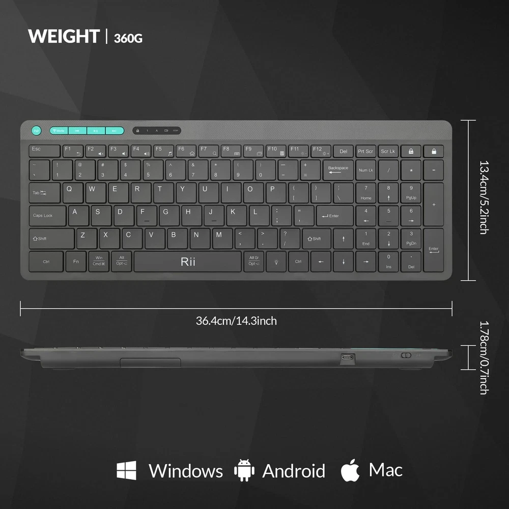 Rii Bluetooth Keyboard,Wireless Keyboard Bluetooth 5.1,Dual Model Backlit Keyboard,Rechargeable Keyboard with Number Pad, Compact Keyboard for iPad,Tablet,PC,Computer,Laptop (Black) Product Details Color: Black Brand: Rii MPN: USRT021 EAN: 6974972303169 UPC: Does not apply Brand: Rii Compatible Devices: Projector, Laptop, PC, Tablet, Smartphone Connectivity Technology: Bluetooth, USB-A Keyboard Description: Rii Bluetooth keyboard ,Dual Model Wireless Keyboard Bluetooth 5.0,Multi-Device keyboard with Number Pad for PC,Tablet ,office ,school See more Recommended Uses For Product: Everyday Use Special Feature: wireless keyboard with Backlit, keyboard with Dual Mode:Bluetooth 5.1+2.4G USB Dongle, Compact keyboard with Number pad, Bluetooth keyboard with silent keys, Multi Device Keyboard See more Color: Black Number of Keys: 105 Keyboard backlighting color support: Single Color Product Dimensions: 14"L x 5.2"W x 0.7"H Product Dimensions: 14 x 5.2 x 0.7 inches Item Weight: 1.06 pounds Manufacturer: Rii Country of Origin: China Item model number: USRT021 Batteries: 1 Lithium Ion batteries required. (included) Date First Available: September 27, 2024 Dual-Mode KeyboardWireless keyboard with Bluetooth 5.1 +2.4G modes and one switch button to control the two connections . The keyboard can connect one device through Bluetooth and another device through a 2.4GHz USB receiver. Connection distance upto 10m. with full size QWERTY keys and number pad . Rechargeable Keyboard Bluetooth Keyboard with rechargeable battery for environmental sustainability advocates. It could last 60hours continuous working ,140days standby. Featured power-saving takes the keyboard to sleep after 10 minutes of in Backlight Keyboard Compact Keyboard with Blue &Green LED Backlight.Turn on the Backlight makes your typing cool and clear. Compact Keyboard with Numeric KeypadMulti Device Keyboard with a standard numeric keypad. Features hotkeys, Calculator, Fn lock, Mute, Volume up and down, etc., to increase your workflow and productivity. Low Profile Laptop-Style TypingKeyboard with scissor key mechanism,it enhances feedback and stability. The optimized key-travel makes typing more comfortable and precise. Compatible Operation System Keyboard support Windows,Anroid,Mac OS,PC,Desktop,Smart TV,Android TV Box,Raspberry Pi.