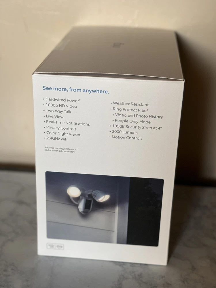 Smart Home Compatibility:Amazon Alexa, Google Assistant, Google HomeNumber of Channels:1Smart Home Protocol:Wi-FiNumber of Cameras Included:1Operating Sound Rating:105 dBPower Source:HardwiredType:Surveillance CameraCompatible Brand:RingConnectivity:Wi-Fi, WiredLocation:Indoor/OutdoorBrand:RingColor:WhiteSurveillance Technology:IP/NetworkMPN:NOT SPECIFIEDFeatures:Light Sensor, Motion/PIR Activated, Outdoor/Weatherproof, Wi-FiMaximum Resolution:1920x1080Color Mode:ColorModel:Ring Floodlight Cam Wired Plus