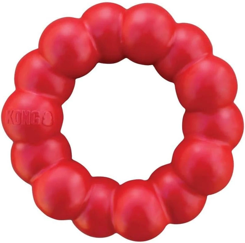 Durable Dog Ring Toy: KONG's Ring chew toys are designed with KONG's durable natural rubber, making it a long-lasting dog toy essential Natural Rubber Ring for Enriching Playtime: This rubber dog toy satisfies your pup's natural instinct to chew, promoting healthy teeth and gums Chew Toy for Entertaining Dogs: This KONG chew toy for dogs offers entertainment and supports healthy chewing habits Made in the USA: Globally sourced materials. KONG has been innovating since 1976 to enrich the lives of pets with the highest quality pet toys and treats. Covered by KONG's Satisfaction Guarantee KONG: Since not all toys are created equal, it’s always best to supervise your dog during play. Supervised play will help toys last longer and keep your dog safe. No dog toy is truly indestructible, so always remove the toy from playtime if damaged The KONG Ring is designed for long lasting chew sessions offering enrichment and satisfying a dog’s natural instinct to chew. Made from KONG natural red rubber, the KONG Ring provides ultra-durability and added nubs to give your dog a delightful chewing experience while promoting healthy teeth and gums. Covered by KONG Satisfaction Guarantee. See KONG Satisfaction Guarantee document below for full details.