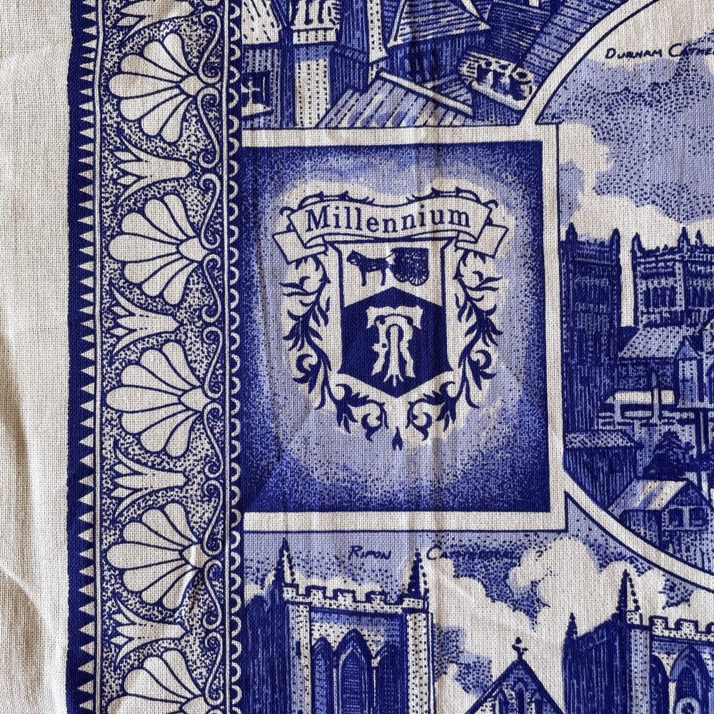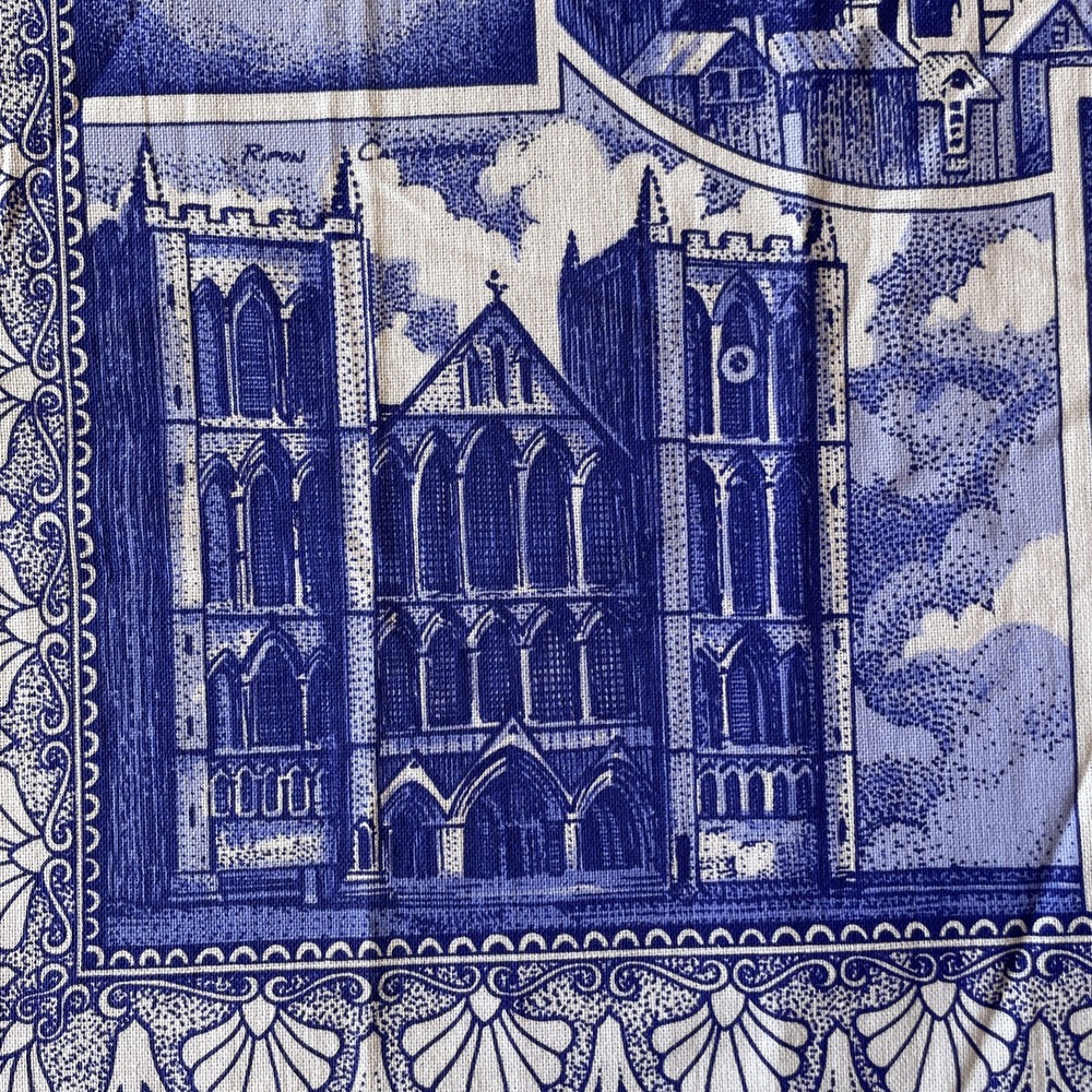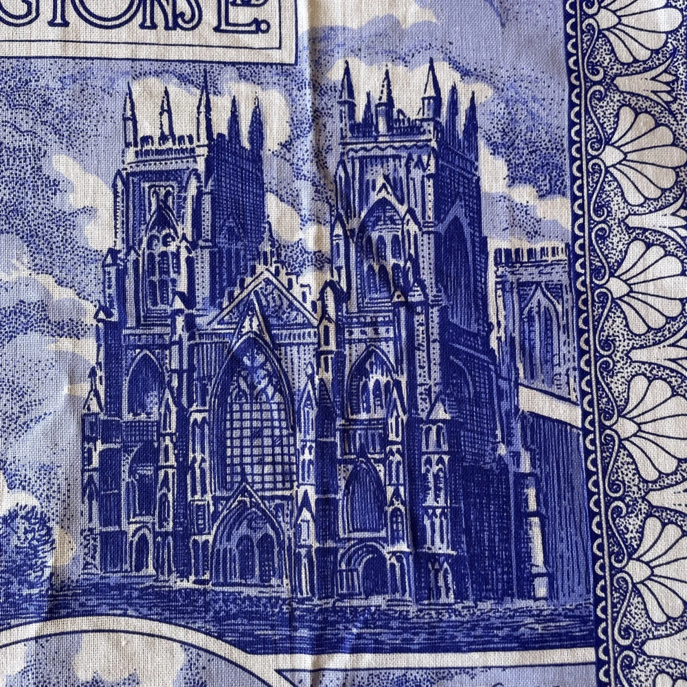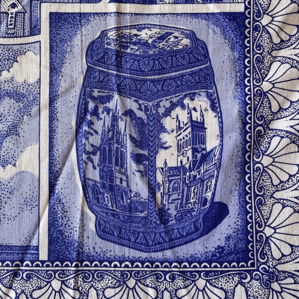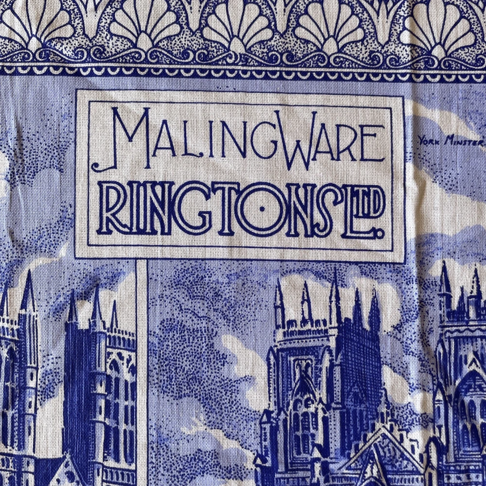 The product is a blue cotton tea towel featuring the iconic Ringtons Ltd brand, with a design of castles and cathedrals. This rectangular tea towel is machine washable up to 140°F and is made in Ireland. Perfect for adding a touch of Topographical & Souvenir theme to your kitchen decor, this high-quality kitchen and tea towel is a must-have for any adult's home.