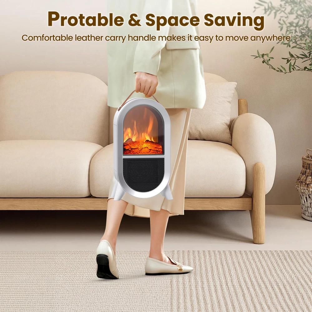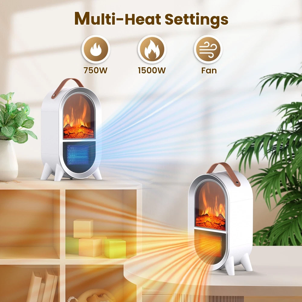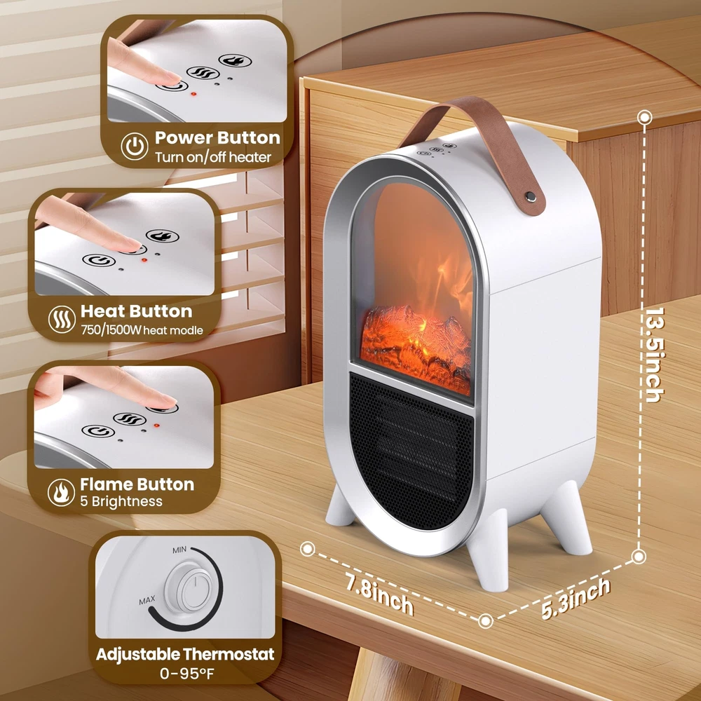 2-IN-1 SPACE HEATER FAN: This small space heater utilizes ceramic heating technology and offers two heating levels, 1500W or 750W and a cool air fan that you can use in both winter and summer ADJUSTABLE THERMOSTAT: Adjust the thermostat to MIN, the heater will keep blowing cold air, adjust the thermostat to MAX, the heater will keep blowing hot air, with the thermostat in the middle, the heater will blow air to dissipate once the heater reaches the preset temperature, and then blow hot air again when the temperature falls below the thermostat setting REALISTIC 3D FLAME: This portable electric heater uses resin simulated charcoal to create a realistic 3D dynamic flame without smoke or noise, creating the ambiance of a real fireplace, adding warmth and comfort to your home TIP-OVER & OVERHEAT PROTECTION: This small fireplace heater is made of flame retardant material which effectively reduces any fire hazard. The overheat protection automatically shuts off the heater when it reaches a critical temperature. The tip-over protection system also shuts off the heater when it is accidentally knocked over, and after righting the heater, the heating function needs to be turned on again for added safety, perfect for families with children and pets PORTABLE AND POWERFUL: Our mini heater comes with a carrying strap, allowing you to easily move it to the space you want. Whether it's for your bedroom, living room, study, office or other space, its light weight and convenient design make it the best partner in winter