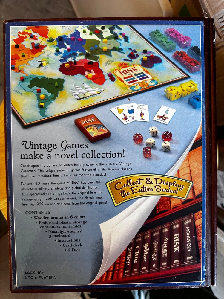 Award:Games 100Gender:Boys & GirlsTheme:StrategyYear:2005Character Family:noneMPN:42752Game Type:Board GameCountry/Region of Manufacture:ChinaBrand:Hasbrogtin13:Does not applyCustom Bundle:NoFeatures:Wooden BoxModified Item:NoRecommended Age Range:8+Age Level:8-11 Years, 12-16 Years, 17 Years & UpType:Complete GameGame Title:RiskMin. Number of Players:2 to 6UPC:Does not apply