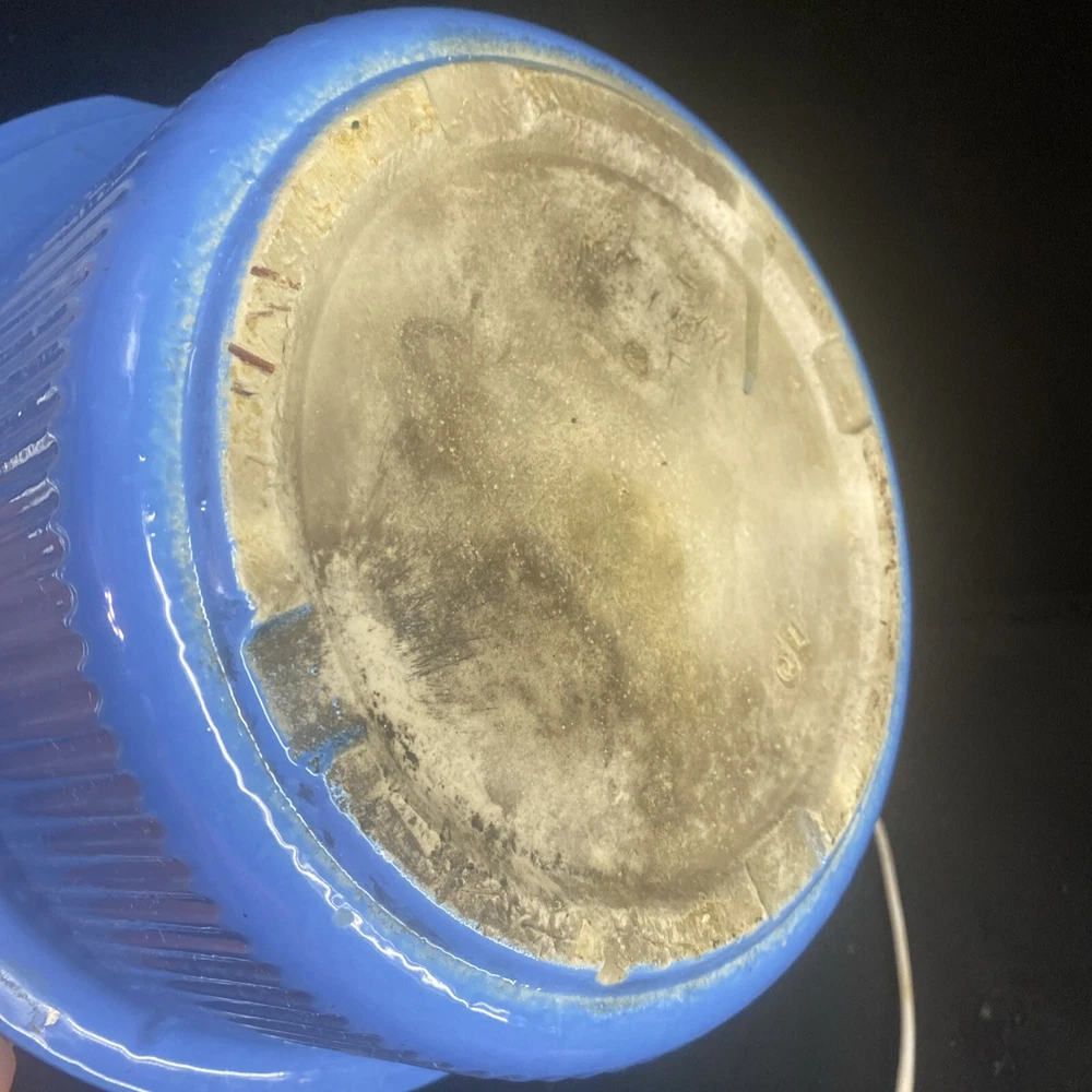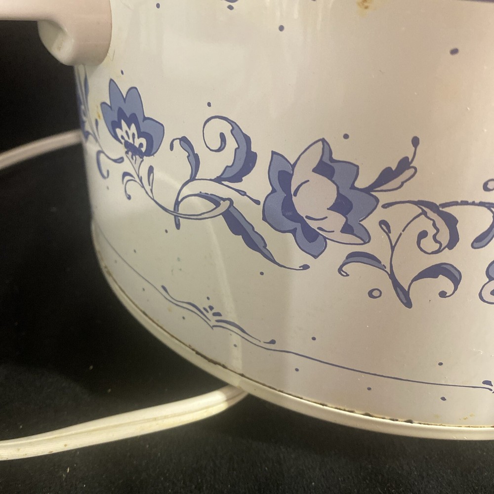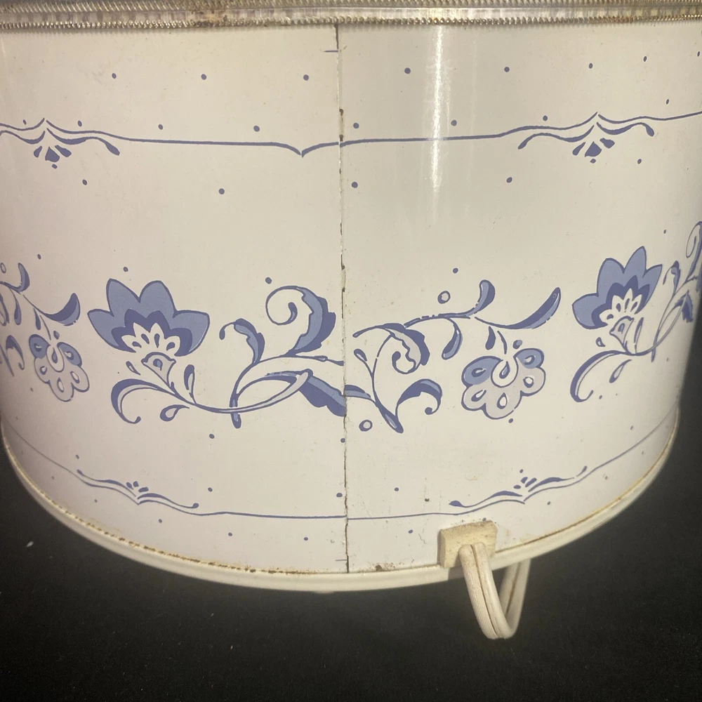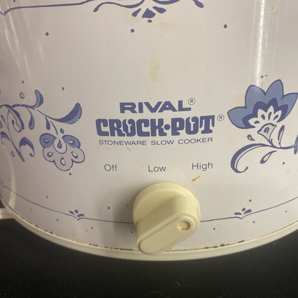 This Rival Crock Pot Stoneware 4 Qt. Slow Cooker Model 3154 is a vintage gem that will add character to your kitchen. The electric cooker is made in the United States and comes in a beautiful blue color with a glossy finish. It has a 4 qt capacity and is made of durable stoneware material. The slow cooker features non-slip feet and can be powered on or off with three different settings/programs. It does not come with a lid, but it is still a great addition to any kitchen. The components included are the pot and base. This Crock-Pot is perfect for those who enjoy cooking and want a reliable and versatile appliance. Has light scratches/ wear / discoloration to the finish. Has some staining to bottom of crock.