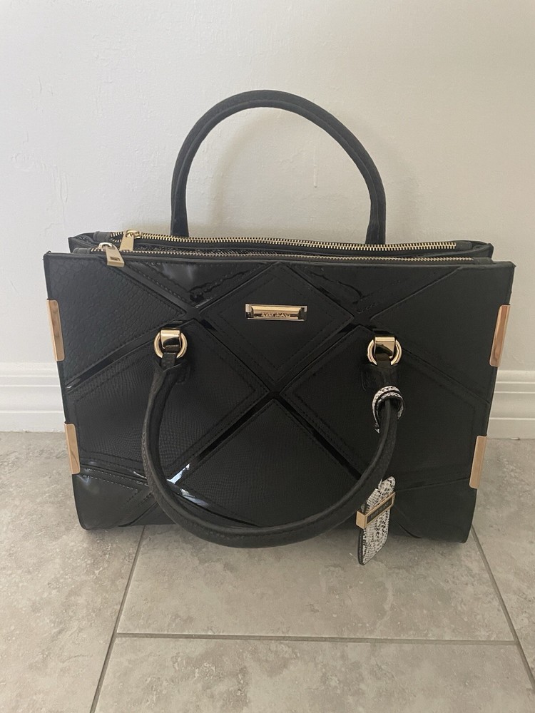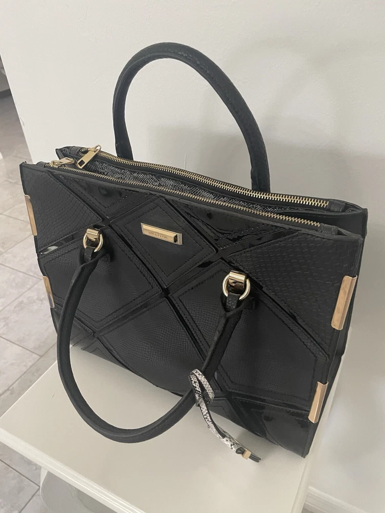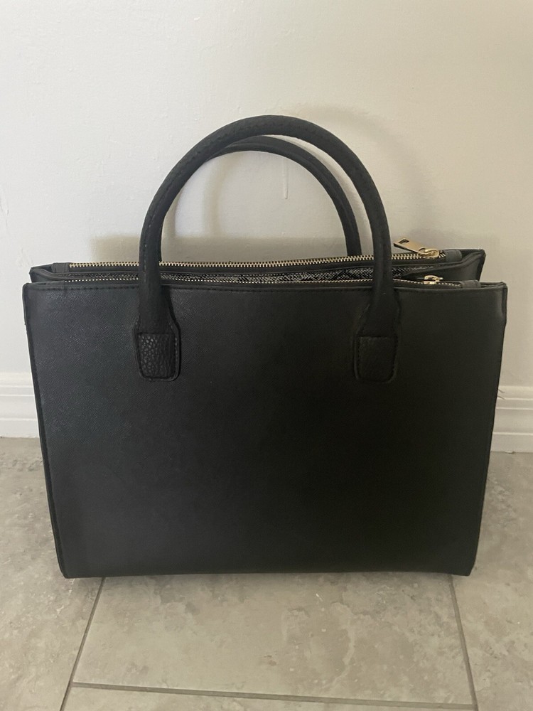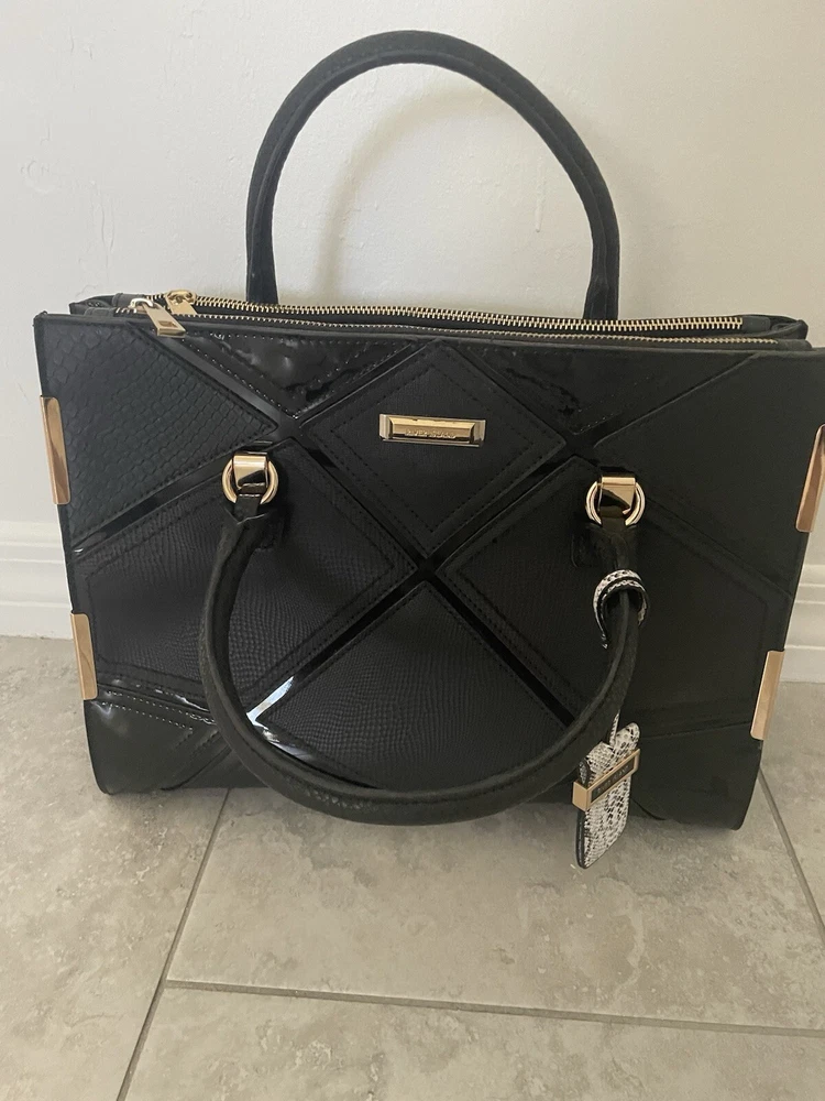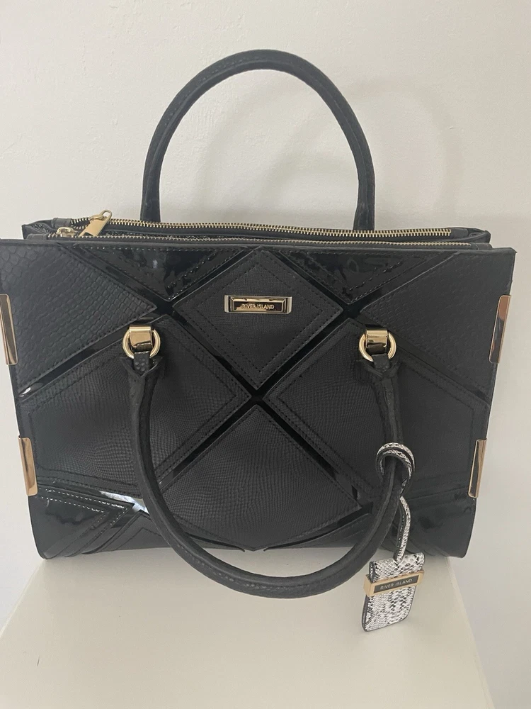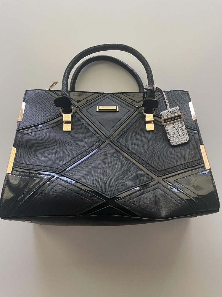 This is a stylish shoulder bag by River Island for women. It features a black faux leather exterior with gold details, including a gold handle/strap and gold lining. The hardware is black, adding a touch of contrast to the design.
