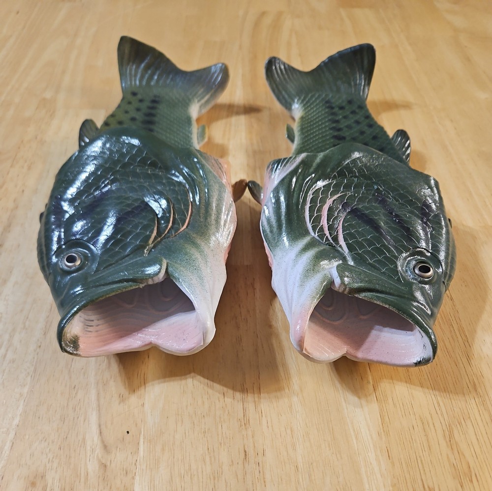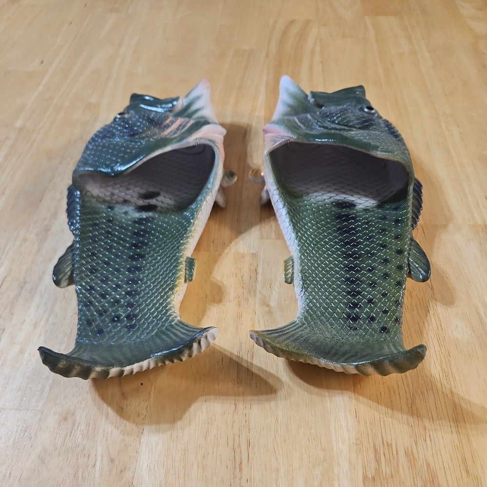 These Rivers Edge Bass Fish rubber slide sandals are designed for men in size 11/12 M. Featuring a fisherman character and fish pattern, these green sandals have a vintage style with a colorful and fun design. Made with a rubber outsole and upper material, these slide sandals are perfect for outdoor activities. The slip-on style and adjustable features make them easy to wear for any man looking for a unique and stylish footwear option.