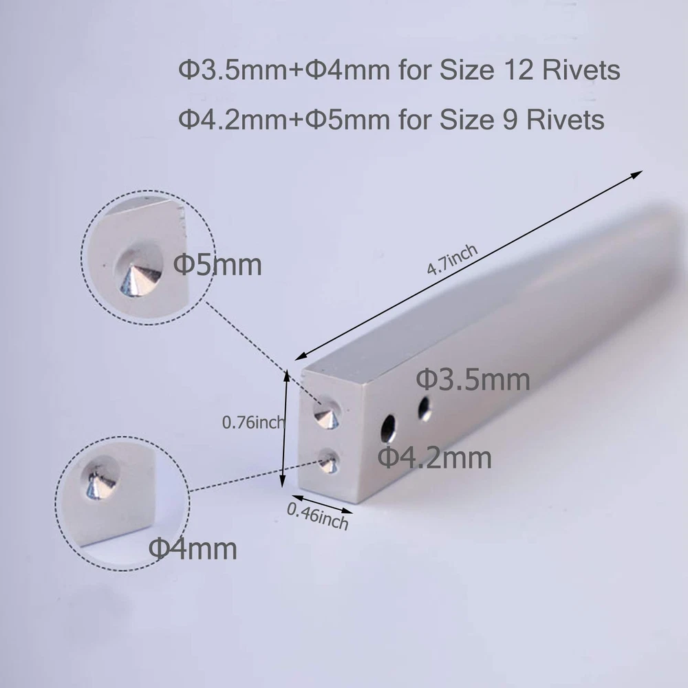How to use? Use the hole in the rivet setter to press tightly together the rivet,leather material and burr. The concave recess in the river seter is then used to spread the end of the rivet over the burr Rivet Setter lets you set Number 9 & number12 copper Rivets and burrs with ease Easy to use: Φ3.5 or Φ4.2 hole to press rivet,leatherand burr together,use river setter concave recess spread the end of the rivet Rivet Setter edges are carefuly rounded to reduce prints in leather,size of rivet governs size of rivet setter Burrs Setter Size: 4.7 x 0.76 x 0.46 inch (L x W x H),fit Copper Rivet SIZE 9 & SIZE 12 Applications to leather Craft,Purses,Bags,leather belts, leather-crafting making, etc