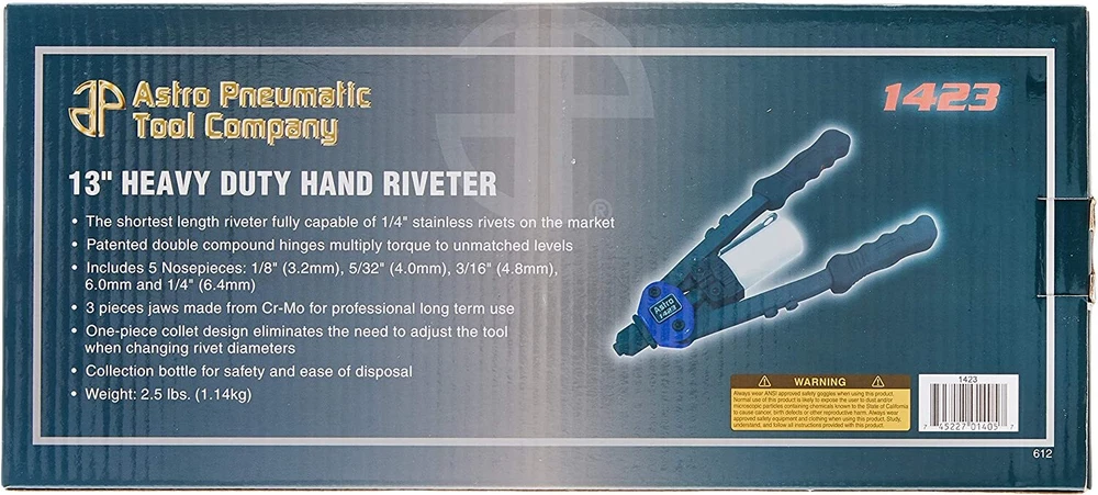 Rivet Gun Kit Rivnut Thread Setting Tool Nut Setter NutSert Metric SAE Riveting Small Size, Large Capacity While being 40% shorter than most standard 1/4" pop riveters, the 1423 maintains the same 1/4" capacity by multiplying leverage with its unique compound hinge design. Use Larger Rivets Even In Confined Spaces By being the shortest full capacity 1/4" riveter in the market, the 1423 requires less space to performs jobs like window regulators and hood struts 5 Different Sizes, Any Material Set steel, aluminum, stainless or copper pop rivets in 1/8", 5/32", 3/16", 6.0mm and 1/4". *Patented structure increases power and leverage when setting POP blind rivets (not for threaded rivet nuts) *Shorter handle with double compound hinges that maximize leverage *Shortest long arm riveter which can operate up to 1/4-Inch (6.4mm) stainless steel rivets *One of our most versatile and powerful hand riveters, taking the hard work out of setting large diameter blind rivets *includes 5 Nosepieces: 1/8-Inch (3.2mm), 5/32-Inch (4.0mm), 3/16-Inch (4.8mm) and two pieces of 1/4-Inch (6.4mm) Payment : 1. We accept PayPal only via eBay Secure Check-Out. Credit card or e-Check via PayPal will be accepted. E-Check will be held until cleared. 2. If you don't have a Paypal account, it is very convenient to sign up and learn more about PayPal at www.PayPal.com . 3. Payment is expected within 7 days of auction closed. Your prompt payment will be greatly appreciated. Unpaid Items will be forfeited per eBay Policies. Shipping : 1. We ship to USA Lower 48 States Only and we offer Free Shipping within the Lower 48 States. We do not ship to FPO, APO or PO Box addresses. For other US locations like Alaska, Hawaii, Puerto Rico, please contact us for additional shipping cost. 2. We do everything we can to ship your orders out as soon as possible. Basically orders are shipped out in 1 business day. To ensure orders can be delivered to you without any problem, please provide your complete and correct physical shipping address when you check out. 3. The delivery is out of our control. Please kindly inform us if you have waited for long time without receiving the item. Once the package is confirmed as lost by the carrier, a new item will be sent out or full refund will be issued. Return : 1. You will always enjoy a 30-day Satisfaction Guarantee . Buyer could return new and unused products in original factory and re-saleable condition for any reason within 30 days from the date of purchase . Please note that all returns should be pre-approved by our customer service team. Before return, please contact our customer service team for RMA number and return instructions. Unauthorized returns or used item will not be accepted. 2. Buyer is responsible for return shipping cost. After returned item is received and confirmed in good/re-sellable condition, we will exchange the item or issue refund according to customer’s option. The refund will be issued through PayPal and the funds should go back to the account which you use to pay for order. 20% restocking fee may apply if returned item is not packed well or returned in bad condition. 3. For defective or damaged item, please contact us and provide as much problem details as possible, we will consider to waive return and ship replacement item or issue full refund to you directly after problem is confirmed.