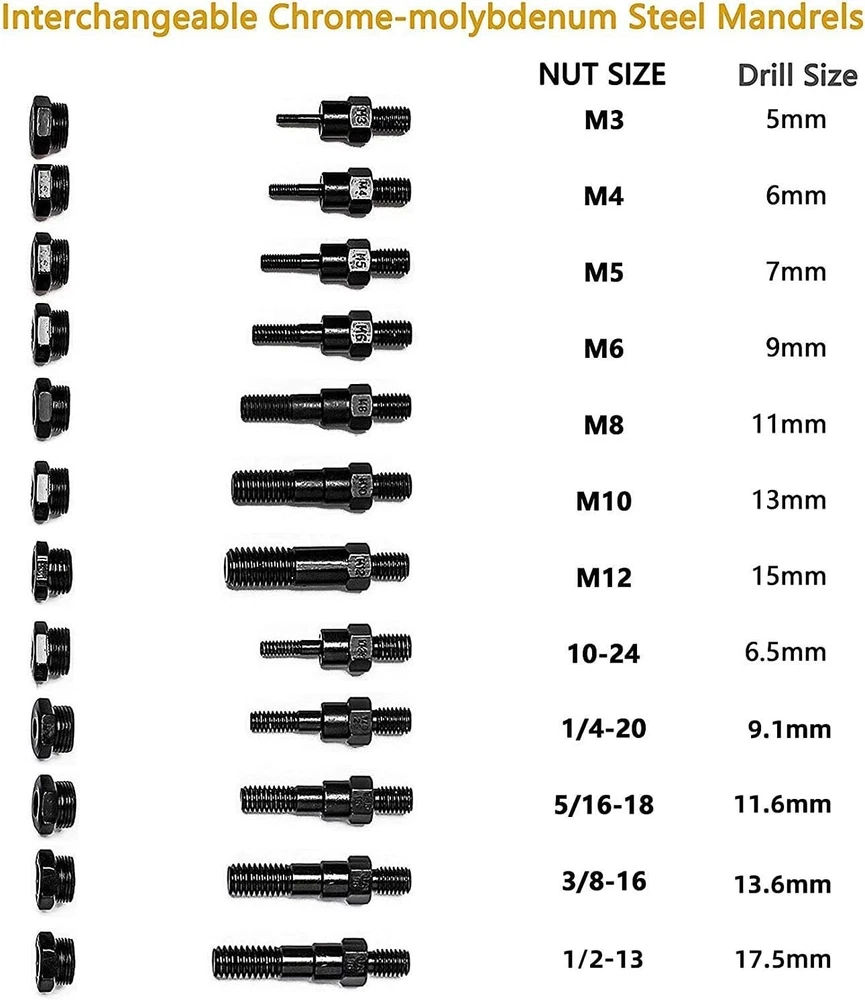 Rivet Nut Gun Kit Rivnut Setting Tools Nut Setter Tool Hand Blind Riveter 16" with Nut Setting system M3 M4 M5,m6,m8,m10 M12, 10-24, 1/4-20, 5/16-18, 3/8-16, totally 11 mandrels + 110PCS Rivets Nut 【EASY TO USE】- Tool-free quick-change head design make it simple to change mandrels and nose pieces quickly without the need for additional tools, smooth your project and save your time 【DESIGN FOR SAVING ENERGY】- The 16 inch longer carbon steel arm and ergonomic handles with double compound hinges maximizing leverage , it can save more effort than those normal 13 inches rivet nut tool do 【WIDE APPLICATIONS】- Provide a customized fastener solution for wide riveting applications, such as body panels, bicycle attachments, furniture and decorations, especially for off-road / Jeep modifications 【COMPLETE ACCESSORIES】- Equipped with 12PCS interchangeable mandrels(Metric M3 M4 M5 M6 M8 M10 M12; SAE 10-24, 1/4-20, 5/16-18, 3/8-16,1/2-13) and 115pcs rivet nuts 【SATISFACTION & WARRANTY 】2 Year Warranty – If any problem in use,please feel free to contact us, we will reply you as soon as possible. RZX is professional of rivet nut tool filed.We have more than 10 years experiences in rivet Nut tool.We are the the first company sell on Amazon since2014. We more know Rivet nut tool. We only supply”simple,classic,save effort,sturdy,” tool,also our price is competitve.No doubt,we are you best choice. Total Length :410mm Max.working stroke:9mm Designed with round knurled sleeve and adjustable nut system . Suitable for rivet sizes :M3 M4 M5,m6,m8,m10 M12, 10-24, 1/4-20 , 5/16-18,3/8-10.1/2-13 packed by box M8 Mandrel already on the tool so the plastic box is empty. Shipping We offer FREE shipping on all orders! We ship within Three business days of payment, usually sooner. We use a selection of shipping services such as UPS, FedEx, USPS etc. We only ship to the lower 48 states, no APO/FPO addresses or PO Boxes allowed. Local pickups and combined shipping options are not provided at this time. Return You can return a product for up to 30 days from the date you purchased it. Any product you return must be in the same condition you received it and in the original packaging. Please keep the receipt. Payment We accept payment by any of the following methods: PayPal Please pay as soon as possible after winning an auction, as that will allow us to post your item to you sooner! Feedback Customer satisfaction is very important to us. If you have any problem with your order, please contact us and we will do our best to make you satisfied. Contact Us If you have any queries, please contact us via ebay. We usually respond within 24 hours on weekdays. Please visit our eBay store to check out other items for sale! Thank you for shopping at our store.