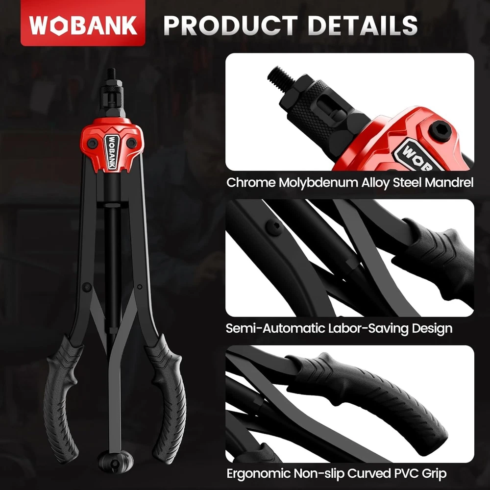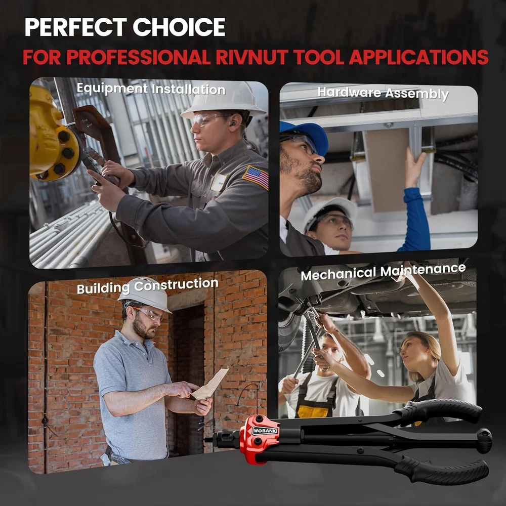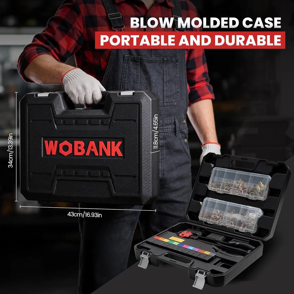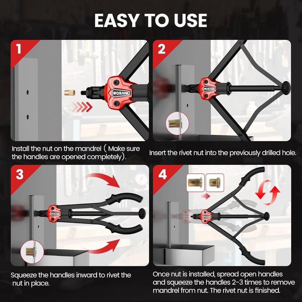 Free eBay listing template designed by dewiso.com Rivet Nut Tool, 16" Heavy Duty Rivnut Tool Kit with 12PCS Metric/SAE Mandrels, 230PCS Rivet Nuts, Wrench, Gloves and Carrying Case, Auto Release Nut Design for Automotive, Construction & DIY FREE AND FAST SHIPPING! 【Complete All-in-One Kit】 This rivet nut tool kit includes a 16-inch rivnut tool, equipped with 12 mandrels (metric M3, M4, M5, M6, M8, M10, M12; SAE 10-24", 1/4-20", 5/16-18", 3/8-16", 1/2-13"), 230 nuts, plus a multi-functional wrench, a pair of gloves and an operation manual. 【Labor-saving Design】 Engineered with a handle connecting rod design, our rivet nut tool automatically releases the rivet nut after just 2–3 squeezes. It is equipped with an ergonomic anti-slip and curved rubber-coated handle, which is comfortable to hold and not easy to fall off. 【Superior Quality】 The professional nutsert tool kit handle is made of carbon steel and processed through high-temperature heat treatment, featuring excellent corrosion resistance and anti-deformation performance, with a long service life. 【Wide Application】 This heavy-duty rivet nut tool set is ideal for the fastening and riveting of metal plates and pipes, and widely applicable to assembly and maintenance work across multiple fields such as automotive, electronics, and construction, with strong practical compatibility. 【Convenient Storage】 The set is equipped with a sturdy blow-molded outer box, which is portable and durable. Metric and imperial nuts are respectively placed in two white PP boxes, and the mandrels are placed in separate plastic boxes marked with specifications for easy search and maintenance. Product We offer a 30-Day Return Policy on items which you are not completely satisfied with. You have the option for a full-refund or an exchange of the item. No returns are available on items shipped outside of the US . Shipping We offer Free Shipping to the US and ship within 2 business days of payment, usually sooner. We use UPS express shipping. That's why your products are usually delivered within 3 days . Contact We try our very best to make sure every customer is completely satisfied. If there's a problem , message us! We're happy to help. 24/7 live chat available.