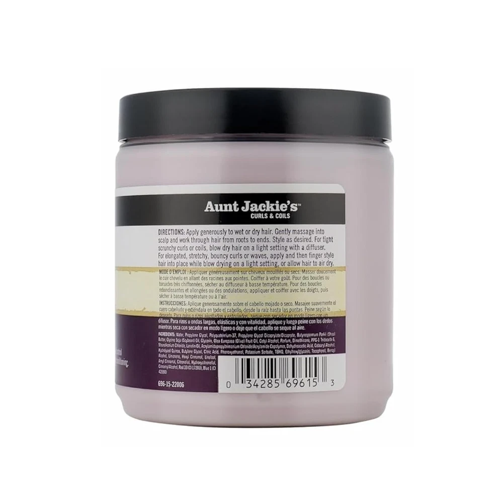 15 oz jar of Aunt Jackie's Curl La La Defining Curl Custard Define, shape and control your hair's curls, waves, coils and braid-outs Add moisture, shine and natural conditioning Enriched with shea butter and olive oil For natural hair curls, coils and waves Great for kiss frizzy, hard-to-tame hair good-bye. The mega-moisture humectants in Curl La La give long-lasting bounce to curls, and shine and definition to spirals and coils. What will it do for my hair? Define your signature look by adding a little or a lot. Whatever your style, rest assure that it will be well-moisturized and soft to the touch, without caking or flaking. Use it as often as needed on wet or dry hair.