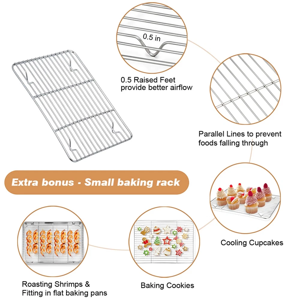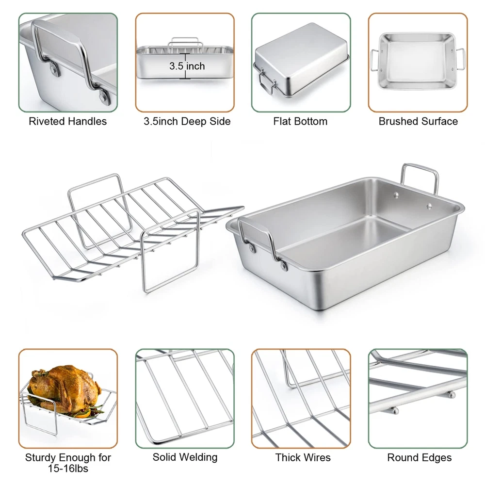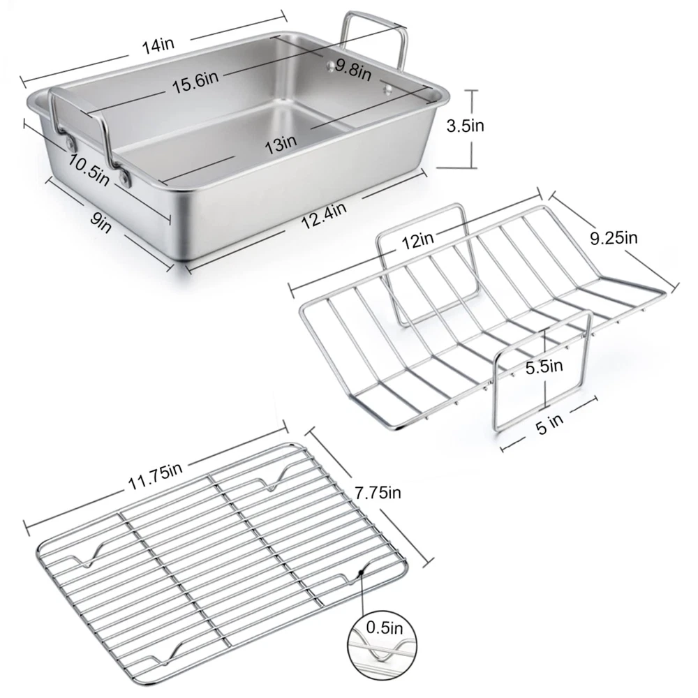 14 Inch Roasting Turkey Lasagna Pan with Racks Set of 3are made of pure stainless steel with sturdy construction without coatings releasing into food, healthy and durable for daily use. The flat baking rack not only fits perfectly in roasting pan but also removable for daily baking /cooling needs. All 3 pieces are dishwasher safe to save your labor and time. This roasting pan with racks set is a wonderful gift to your family or friends who love cooking. SPECIFICATION Material: Pure Stainless Steel Craft: Brushed surface of the pan, Mirror Finish of the rack, Firmly Riveted upright handles, Deep Size Features: Heavy duty, Non-, Healthy, Dishwasher safe, Wearproof Dimension:1 × Roasting Pan: Overall / Pan outer dimension with Handle: 15.6 × 10.5 × 5.5 – Inch Pan outer: 14 x 10.5 x 3.5-Inch, Pan inner: 13.3 × 9.8 x 3.5- Inch Bottom: 9 x 12.4-Inch, Handle: 4 × 2-Inch 1 × V Rack:12 L x 9.25 W-Inch Handle: 5.5 × 5-Inch1 × Cooling Rack: 11.75 x 7.75 × 0.5-Inch Advantages: 1. Stainless steel roasting pan with racks are anti-rust, without any substance release into your food, healthy for daily us. 2. Easy to clean and dishwasher safe to save your time and labor, but aluminum provide hand wash only. 3. Solid riveted handles stand erect, provide a secure and comfort grip, easy to put in / out of the oven with the oven mitts. 4. Specially designed with smooth edges without sharp angles, Prevent hurting your hands. 5. Set of 3, more economical than buying them separately, efficient to roast / hold more food at the same time. USING INSTRUCTION 1.Please wash with warm water before first using to wash off any residue left from the manufacturing process. 2.Please clean and dry after using for your daily use, stored in dry place. Healthy: roasting pan with racks are made of high quality heavy duty stainless steel, No coating and harmful substance leaching into your food , Rust resistance and healthy for daily roasting, Great alternative to aluminum pan and racks Heavy Duty Pan: Solid and heavy duty construction for lasting a long serving life, 2 wide and rigid stainless handles riveted firmly, For a comfort and secure grip even with oven mitts, 3.5 inch deep side for containing more food and prevent sauce spilling, Brushed finish for abrasion resistance V-Rack & Flat Rack: The thicker and sturdy wires of V- rack for stably supporting heavy stuff, Spaced lines to help air circulation for even and complete roasting and great browning, Leaving large space for flat rack to bake vegetables below, The flat rack also greatly removable for daily use Dishwasher Safe: All the pan and racks are dishwasher safe to save your time and labor, Superior brushed finish for effortlessly cleaning, Smooth edge without rough spots prevent hurting your hands, Easy clean up even in hand-wash Multi-use: The Roasting pan is perfect for Baking lasagnas / vegetables, Removable V-rack is ideal for roasting turkey / brisket, Flat cooling rack greatly fits in other medium or large baking pan, Separately cooling dessert / baking meat, Great set for daily cooking and holiday entertaining like Thanksgiving and Christmas…