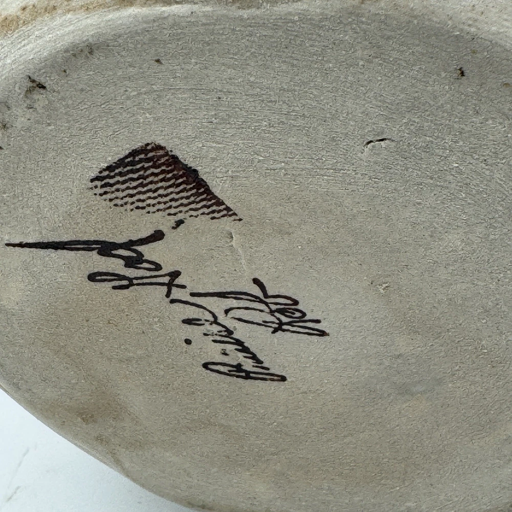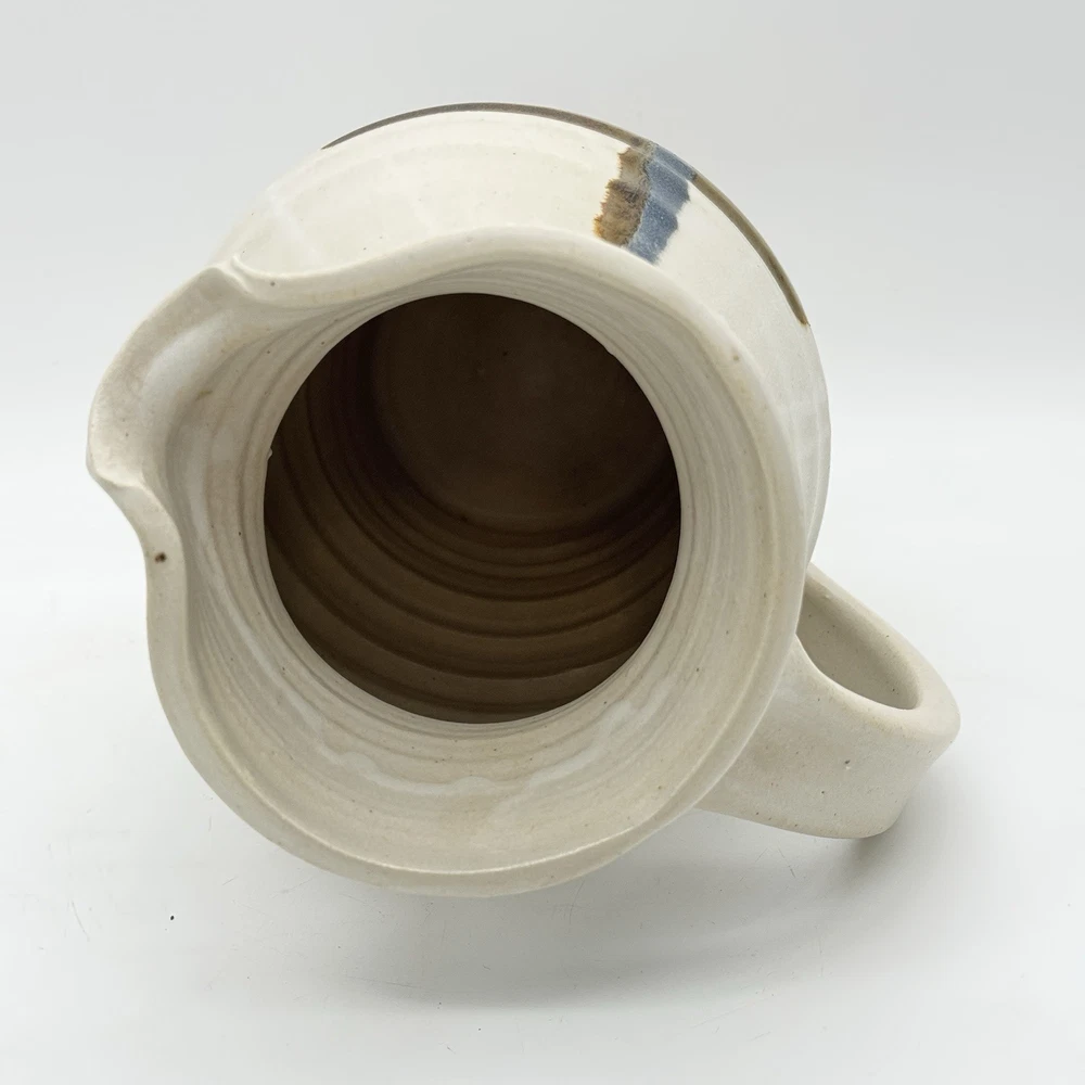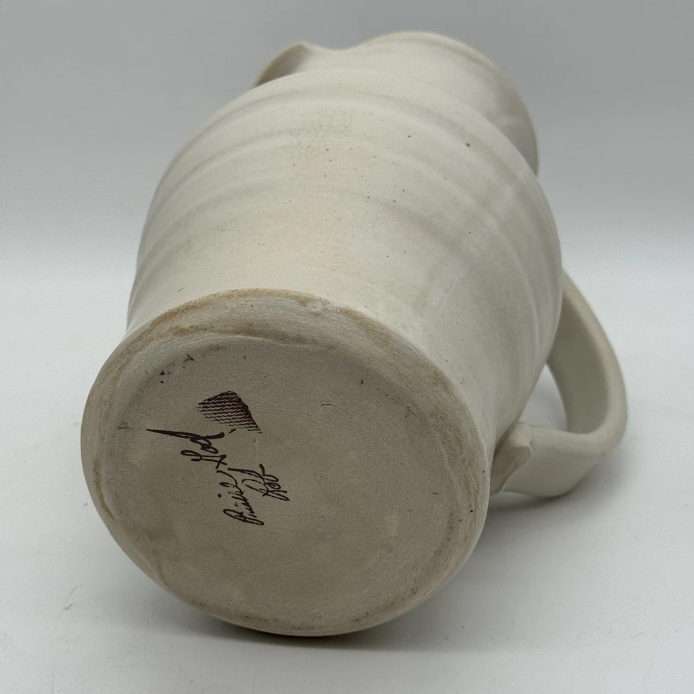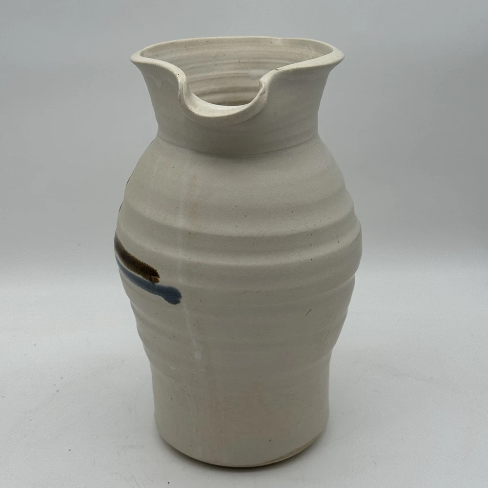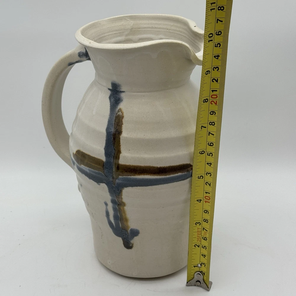 This beautiful 10" handmade pitcher vase is a one-of-a-kind piece created by Rob Grimes. The vase features an abstract cross pattern and is signed by the artist. It is made of high-quality clay pottery and is perfect for displaying your favorite flowers or as a standalone statement piece. No chips or cracks.