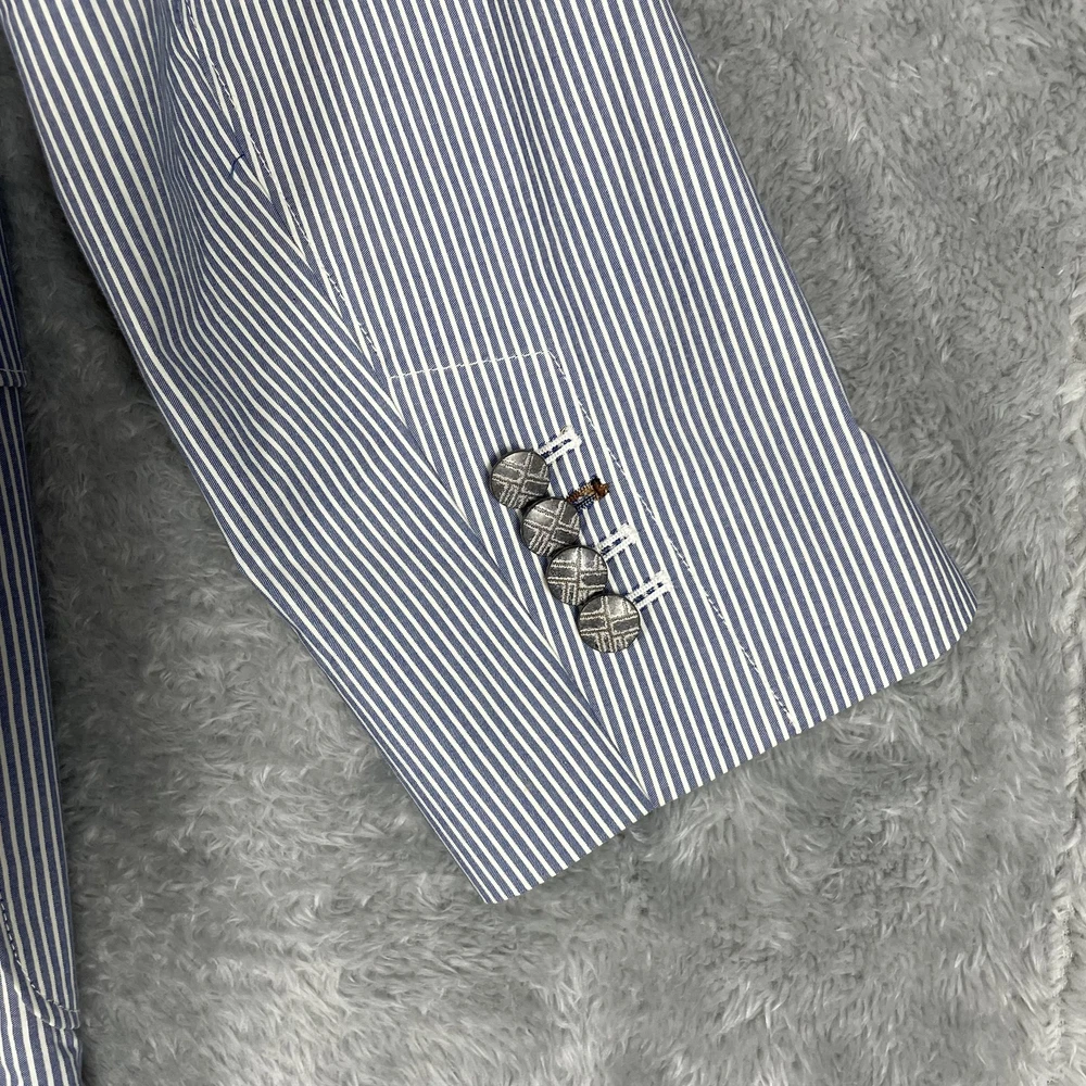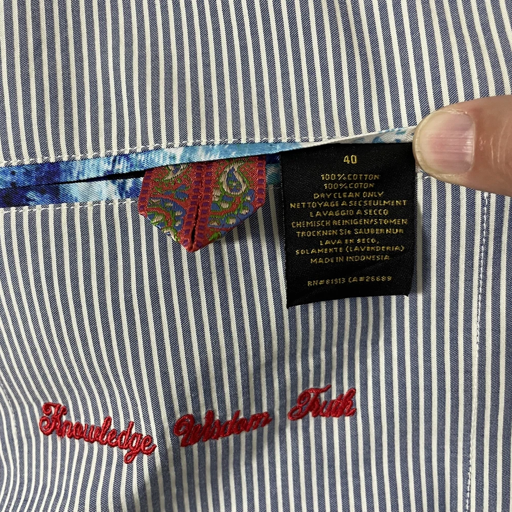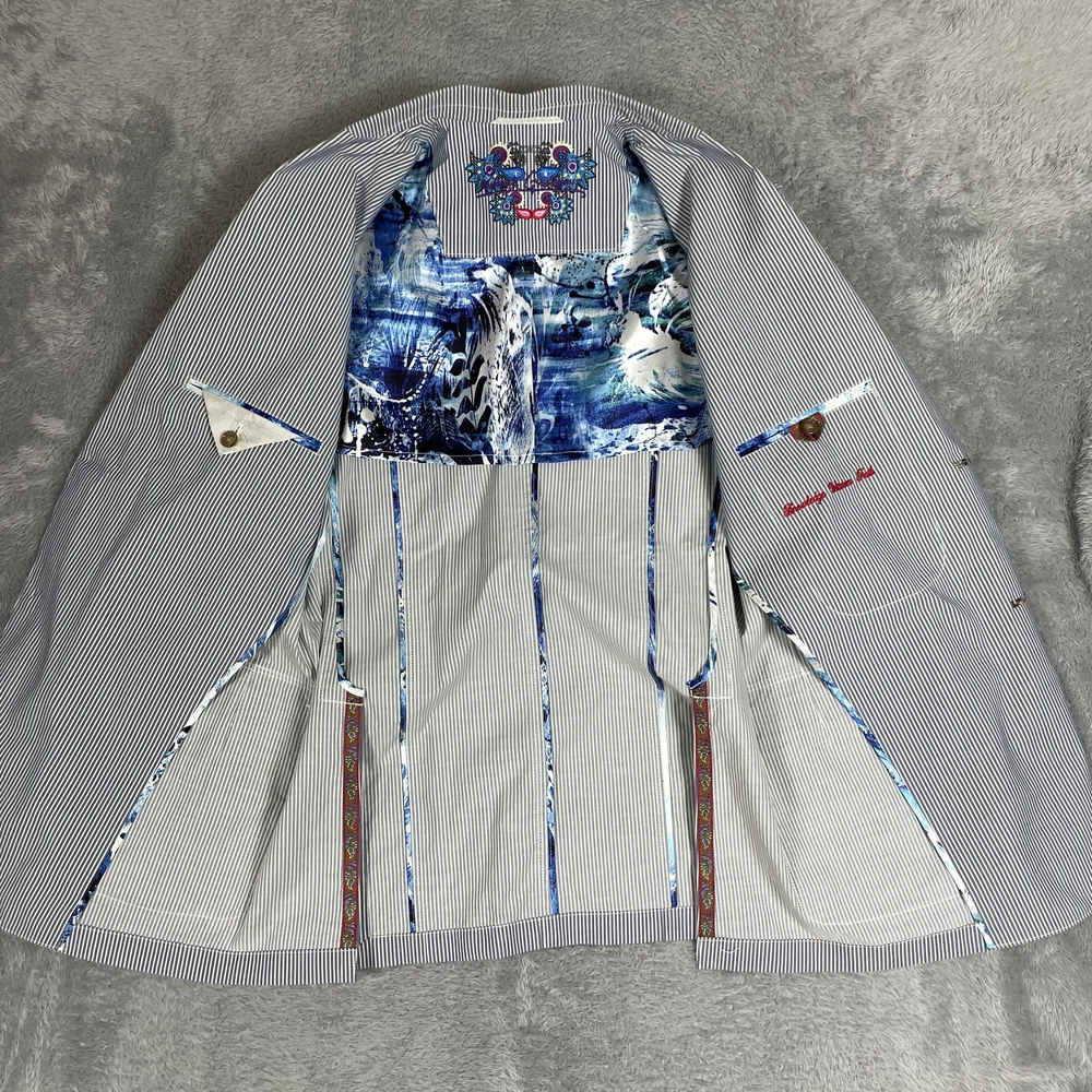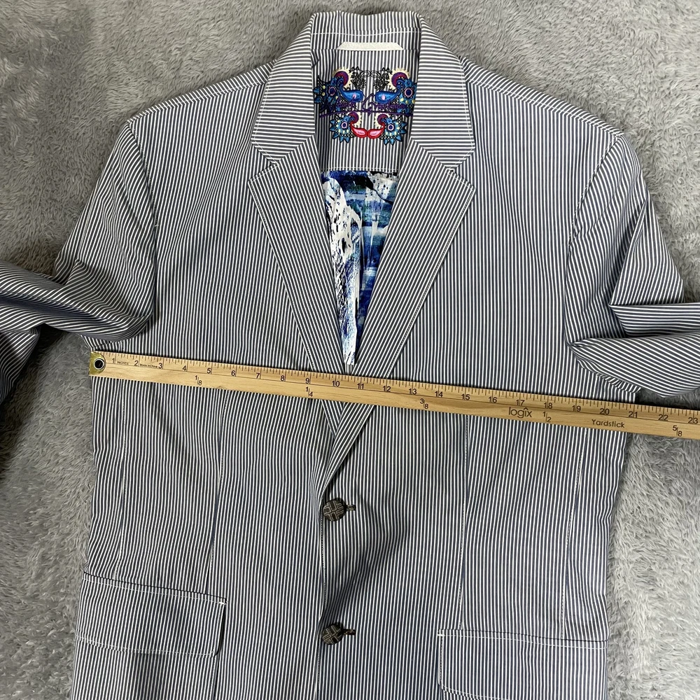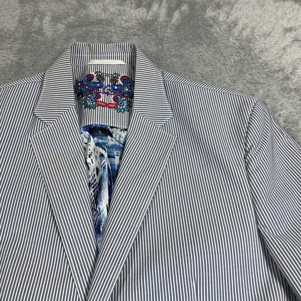 Robert Graham Blazer Mens 40 Blue White Stripe Cotton Sport Coat Modern Unique Condition: Gently worn, two small spots on the back of the shoulder near the collar Material: 100% Cotton Size: 40 (mens) Color: Blue and white with fine vertical pinstripes Features a two-button front closure, double vent back, and four decorative cuff buttons Signature Robert Graham colorful embroidered logo on inside neck Bespoke-inspired contrasting blue artistic lining and interior details Interior embroidery reads "Knowledge Wisdom Truth" Distinctive Robert Graham engraved buttons and contrast sleeve lining Made in Indonesia Approximate measurements are visible in photos for full reference Perfect for dressy events, casual business wear, or making a bold style statement