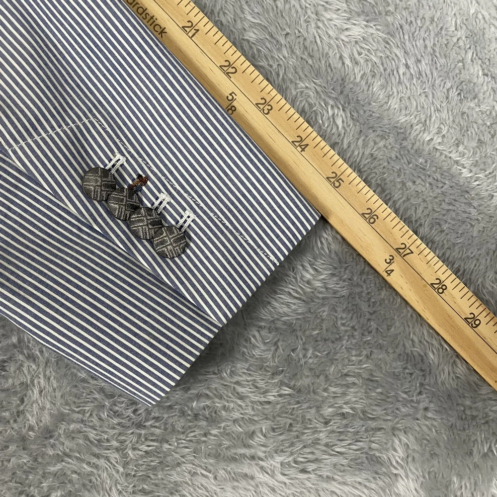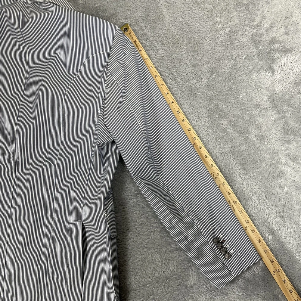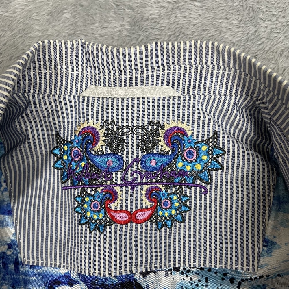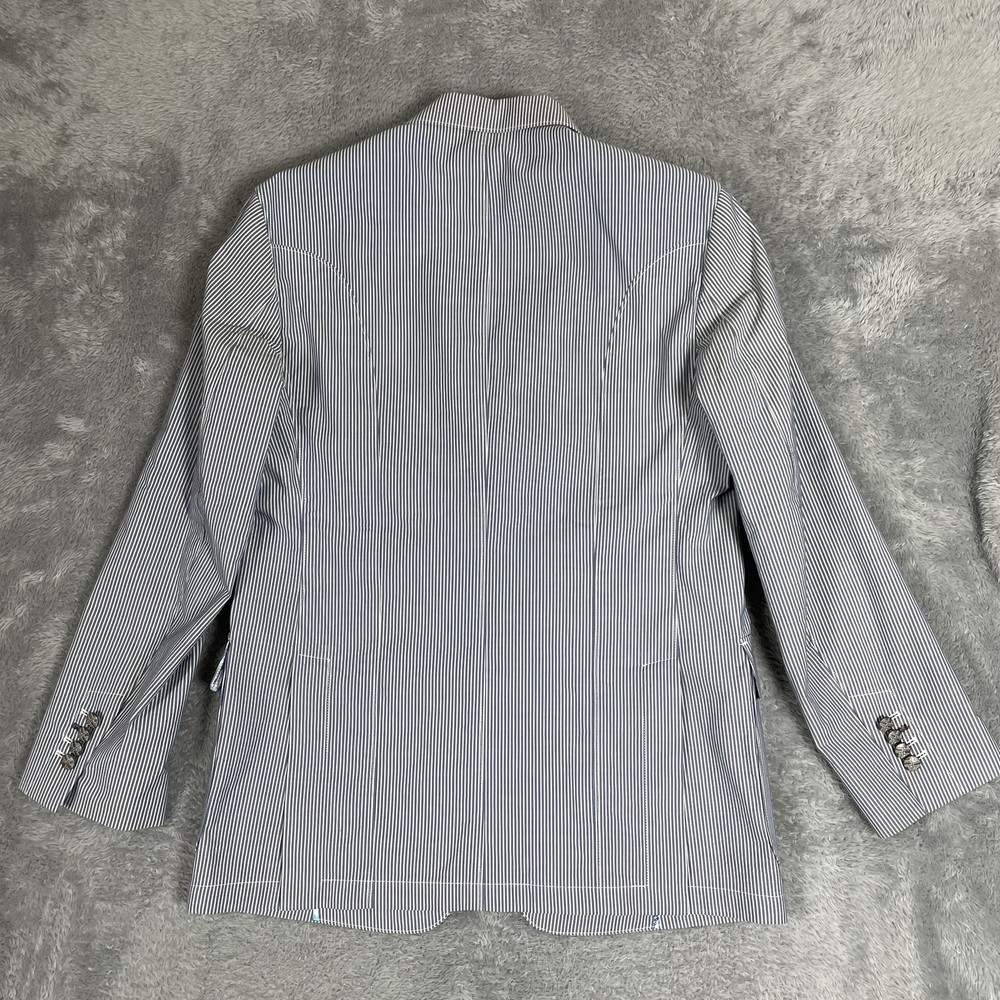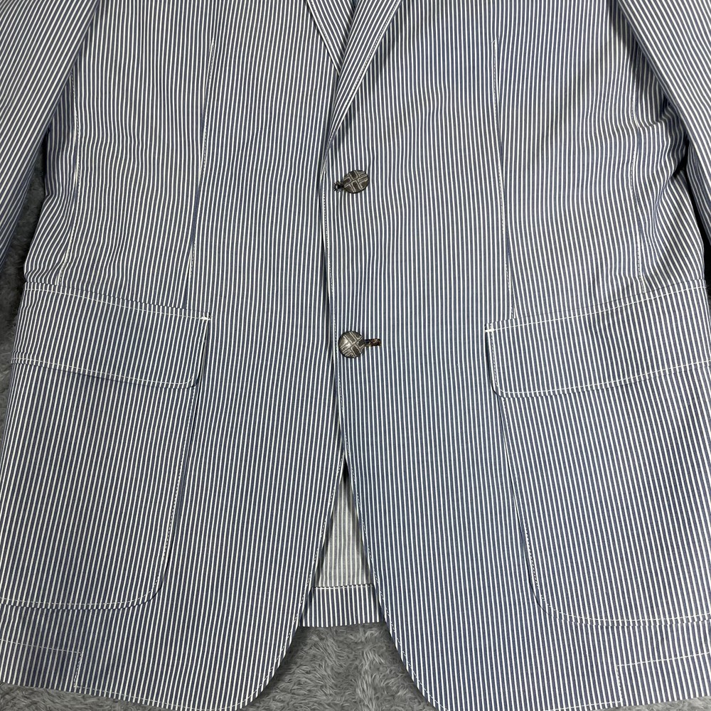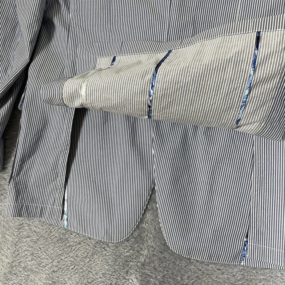 Robert Graham Blazer Mens 40 Blue White Stripe Cotton Sport Coat Modern Unique Condition: Gently worn, two small spots on the back of the shoulder near the collar Material: 100% Cotton Size: 40 (mens) Color: Blue and white with fine vertical pinstripes Features a two-button front closure, double vent back, and four decorative cuff buttons Signature Robert Graham colorful embroidered logo on inside neck Bespoke-inspired contrasting blue artistic lining and interior details Interior embroidery reads "Knowledge Wisdom Truth" Distinctive Robert Graham engraved buttons and contrast sleeve lining Made in Indonesia Approximate measurements are visible in photos for full reference Perfect for dressy events, casual business wear, or making a bold style statement