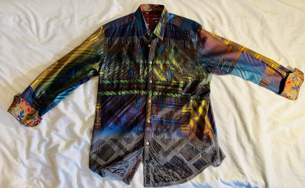 A rare Robert Graham Limited Edition multi design colorful Shirt. The colorful party and festive pattern, embroidered accents, and spread collar make this shirt perfect for any occasion, whether it’s special dinner, a party, special event or formal occasion. The long sleeves and knit fabric make it suitable for any season, while the button closure adds a touch of classic style. This shirt is a large size and fits perfectly. Easy to maintain - made of machine washable cotton and is perfect for men who appreciate a comfortable, yet stylish shirt. Don’t miss out on this unique piece to your collection and wear it proudly.