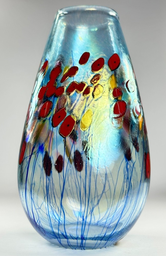 $ 184.8Robert Held Signed Canadian Art Glass Hand Blown Vase Iridescent Poppy Flowers