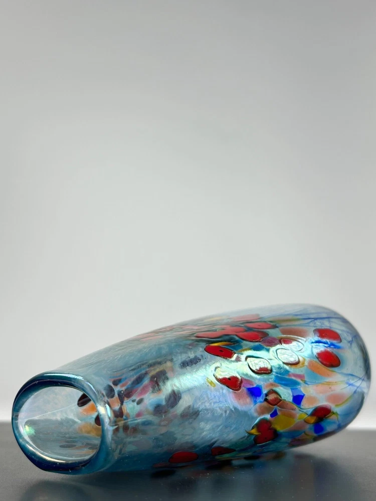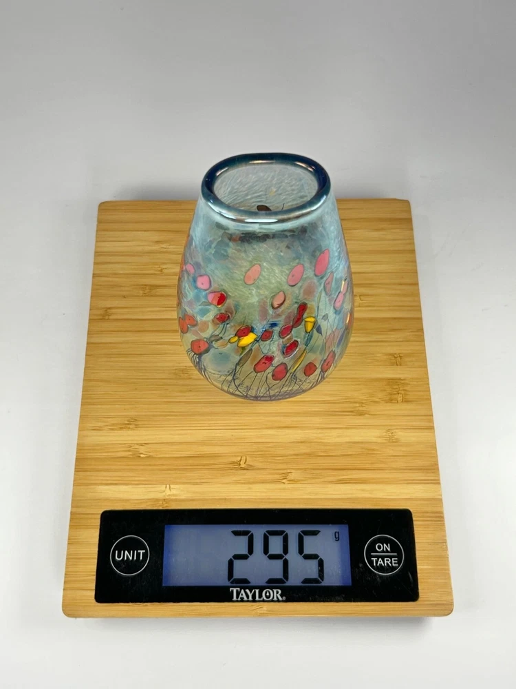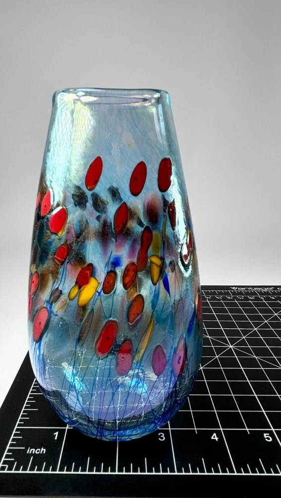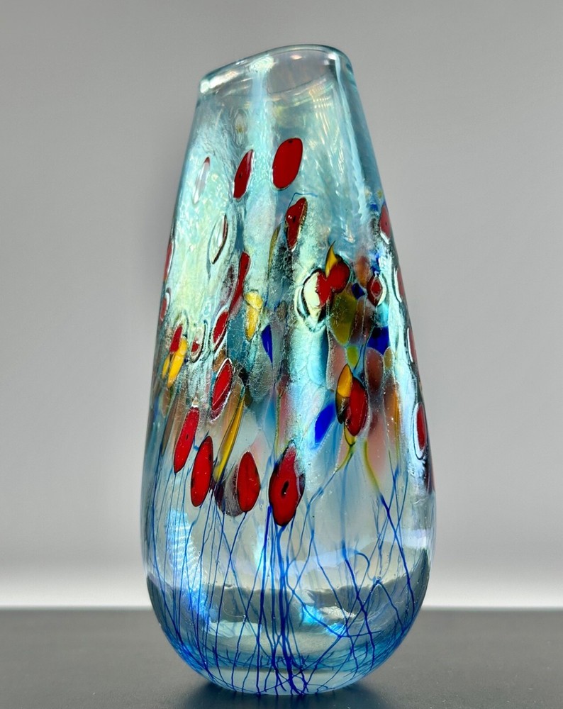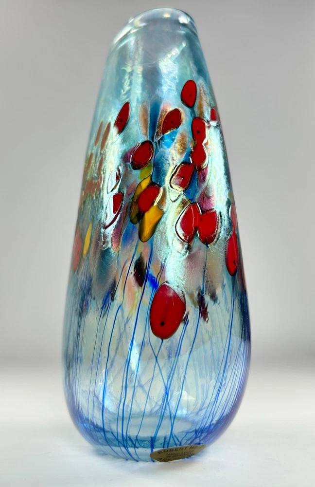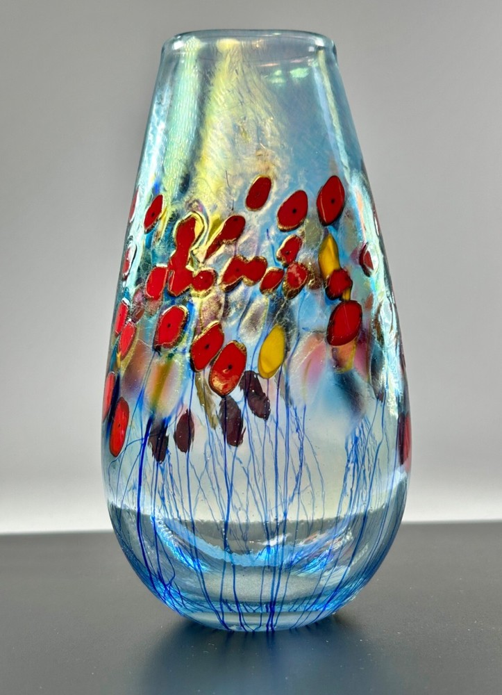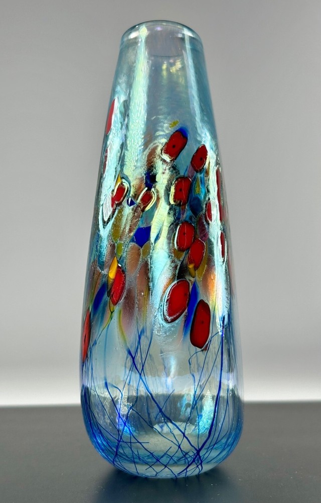 In pristine preowned condition with no flaws to note! Robert Held Art Glass Tall Oblong Vase Hand blown • Handcrafted with unique blown glass technique • Vibrant red & yellow poppy flowers in a millefiori style • Iridescent blue hue allover • Signed on the base for authenticity in his handwriting "Held" • Polished bottom for stability •Oblong oval shaped vase Length/height: 6” Depth: 5.75” Diameter of top: 1.5” Diameter of base: 1.5” Width side to side: 3.25” #robertheld #robertheldartglasspoppyflower #robertheldvase #poppy #poppyflowers #robertheldpoppyflowersvase #robertheldartglass #handblown #handblownartglass #poppyflowers #poppyflowervase #redpoppyflowers #robertheldvase #robertheldartglassvase #handblownglass #handblownglassvase #robertheldglass #robertheldartglassvase