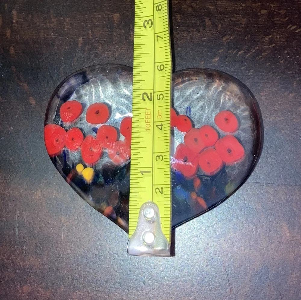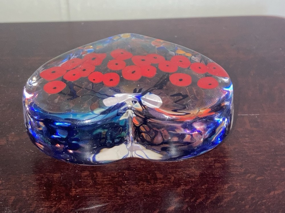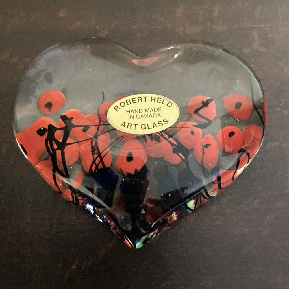 This Robert Held paperweight features a heart shape and is made of multicolored glass, showcasing a contemporary design with California Poppies pattern. Hand-blown in Canada in the late 20th century, this vintage piece is signed by the artist “Held” and is part of the California Poppies product line. The glossy finish and decorative nature make it a charming addition to any collection of art glass paperweights.