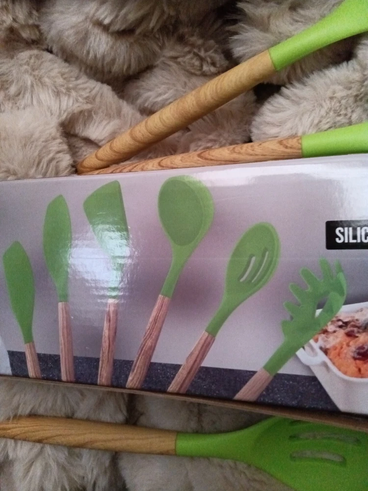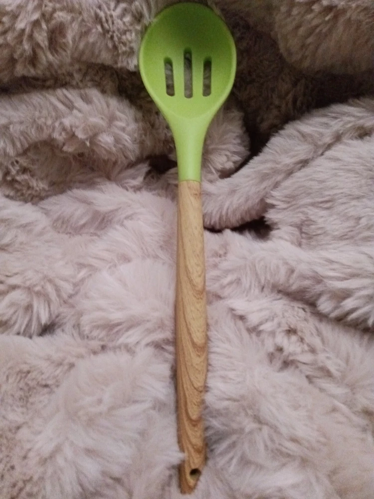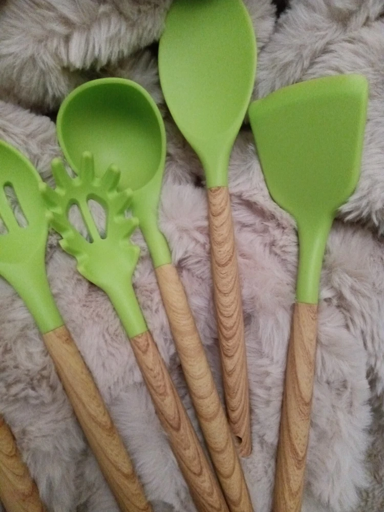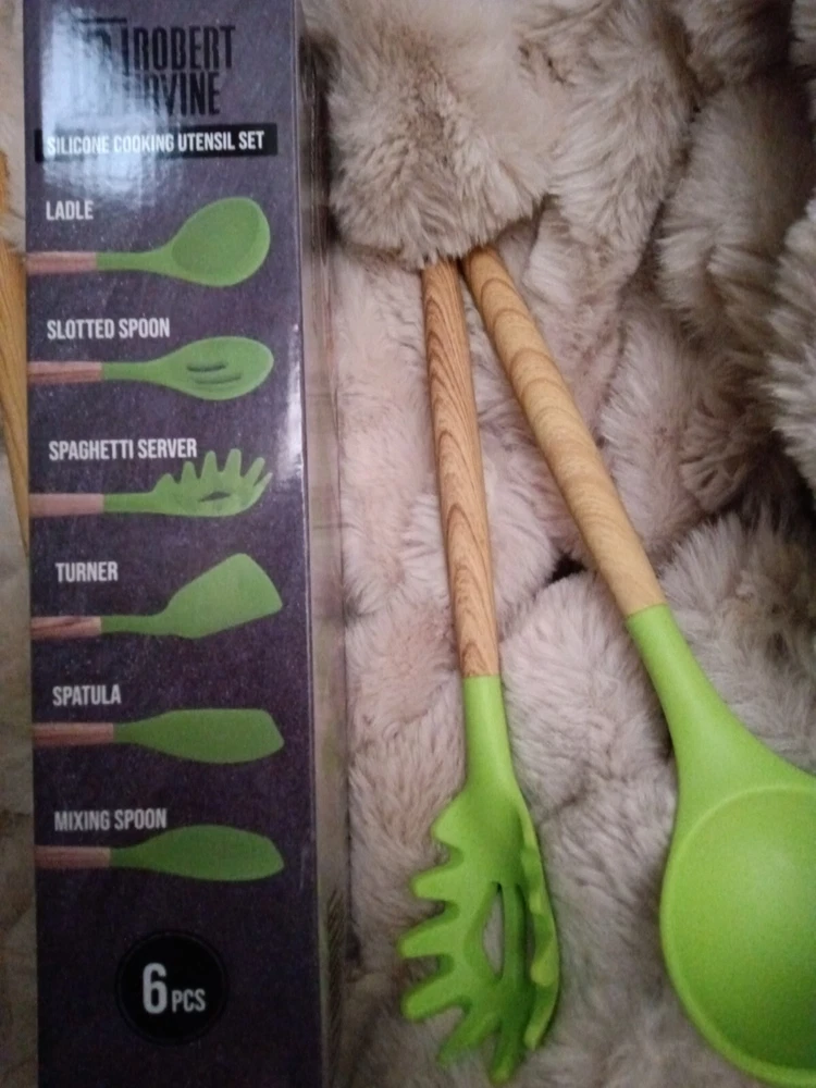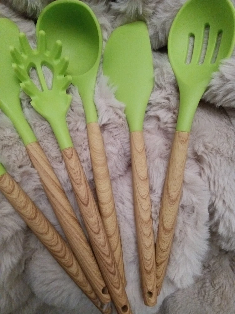 The Robert Irvine Green Silicone Kitchen Cooking Utensil Set includes 6 items with black silicone material and wooden handles. The set features slotted spoons, skimmers, ladle, turner, and spatula. Perfect for cooking and kitchen use, these utensils are durable and easy to handle. Solid (not hollow) wooden handles. Enjoy FREE SHIPPING:-)