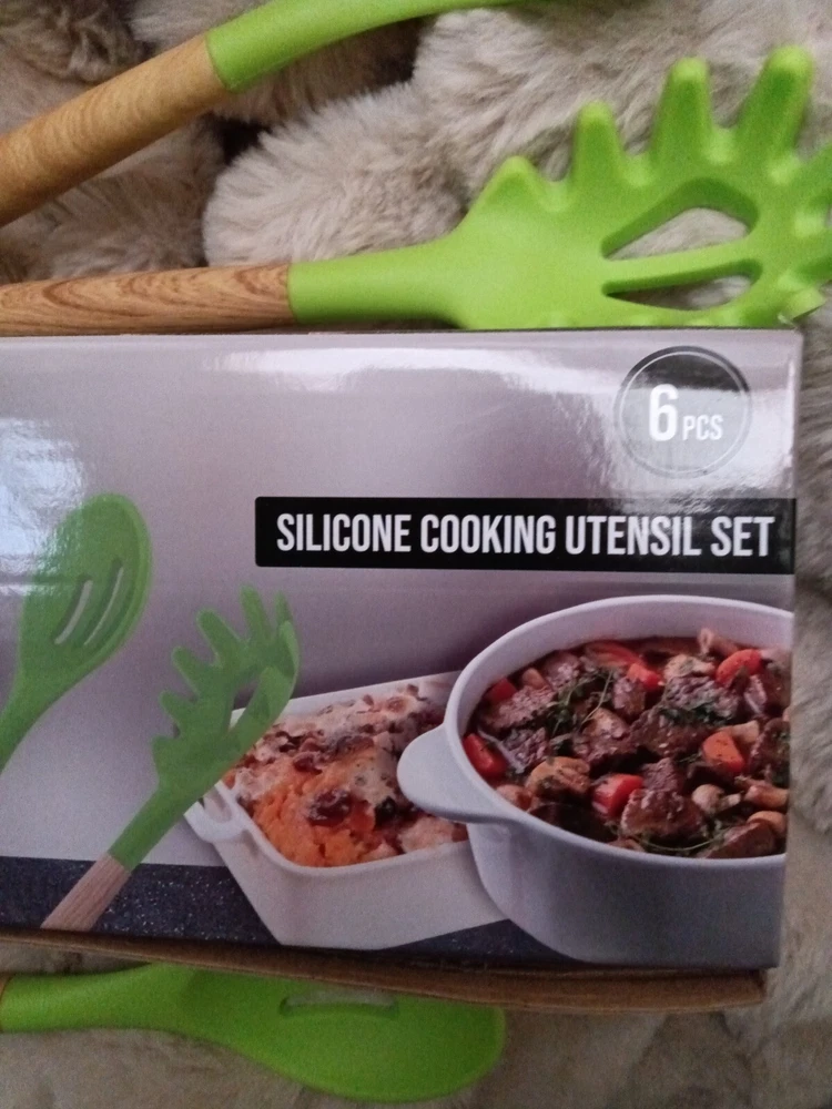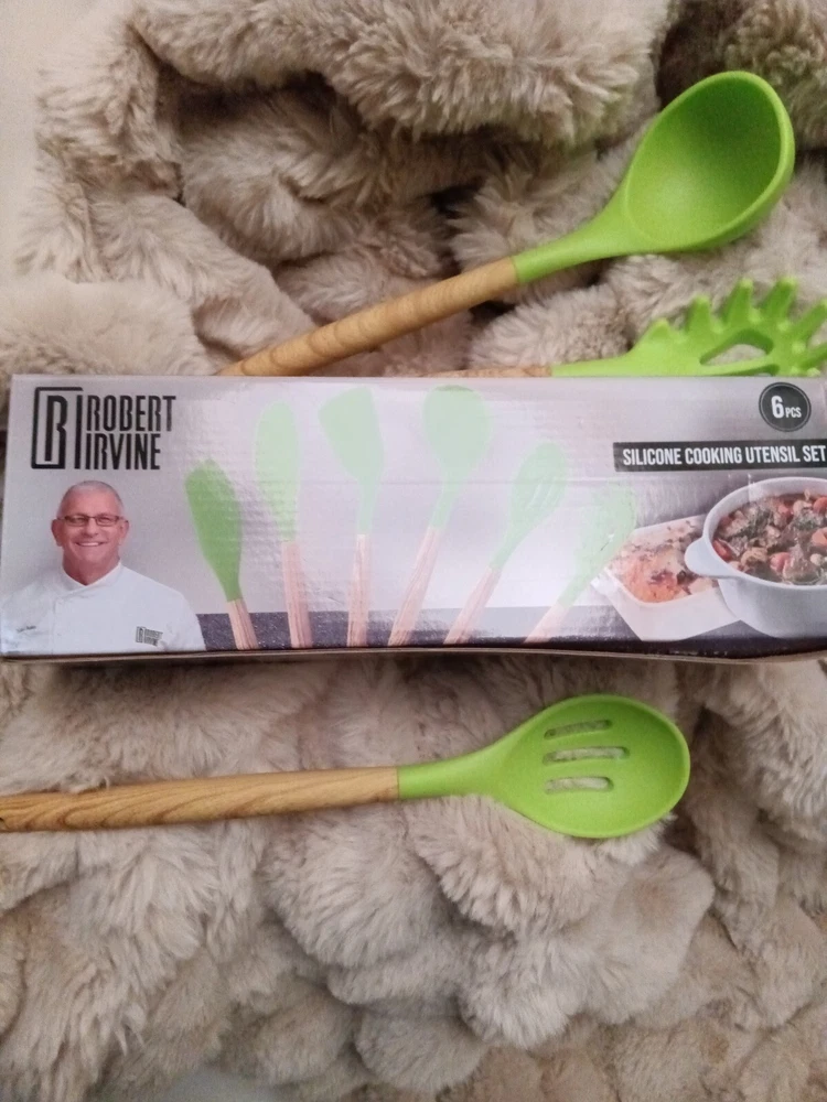 Material: Silicone Color: Black Brand: Robert Irvine Set Includes: Ladle, Slotted Spoons & Skimmers, Spatula, Turner Number of Items in Set: 6 Handle Material: Wooden