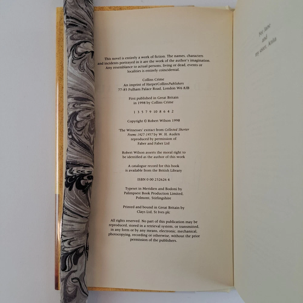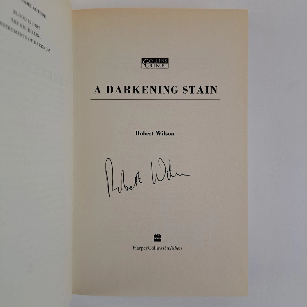 A DARKENING STAIN [Signed] Author: Wilson, Robert Title: A DARKENING STAIN [Signed] Publication: London, UK: Collins Crime, 1998 Edition: First UK Edition, First Printing Description: Octavo, 261 pages. In Near Fine condition with a Near Fine condition dust jacket. Spine is yellow with brown and rust lettering. Dust jacket protected by mylar covering, price uncut: "£15.99" on front flap. Signed flat by Robert Wilson on title page. Shelved in hallway. Seller ID: 1389421 Subject: Literature Welcome to the eBay store of Second Story Books! DC's Oldest Rare and Used Bookstore, Second Story Books operates two open shops in the Washington D.C. metropolitan area. We have an extensive internet presence and provide accredited appraisals member ASA. This listing was created by Bibliopolis.