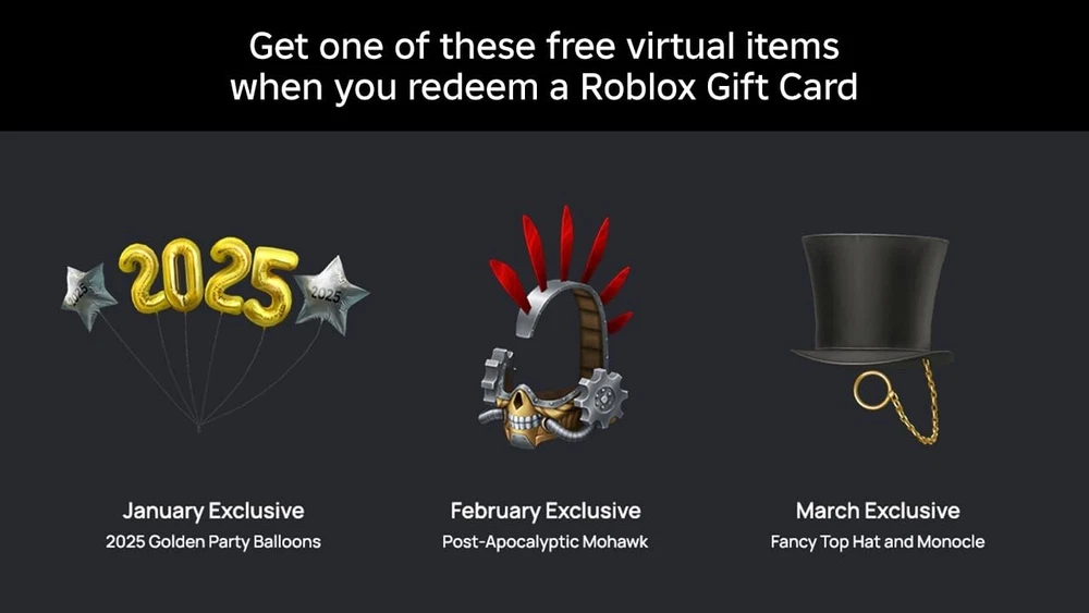 Roblox Gift Cards can only be redeemed in a browser at Roblox.com/redeem. The gift cards can't be redeemed in the Roblox mobile app or any video game console. Deck out your avatar and unlock additional perks in your favorite experiences when you use Roblox Gift Cards to purchase Robux (Roblox's virtual currency). Get exclusive access to virtual items, a monthly Robux stipend, and more by redeeming your gift card for a Roblox Premium subscription. Each gift card grants a free virtual item upon redemption. No returns or refunds on gift cards.