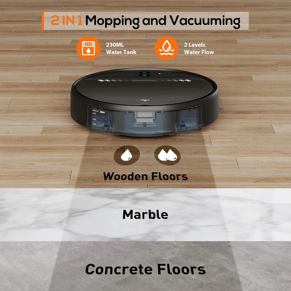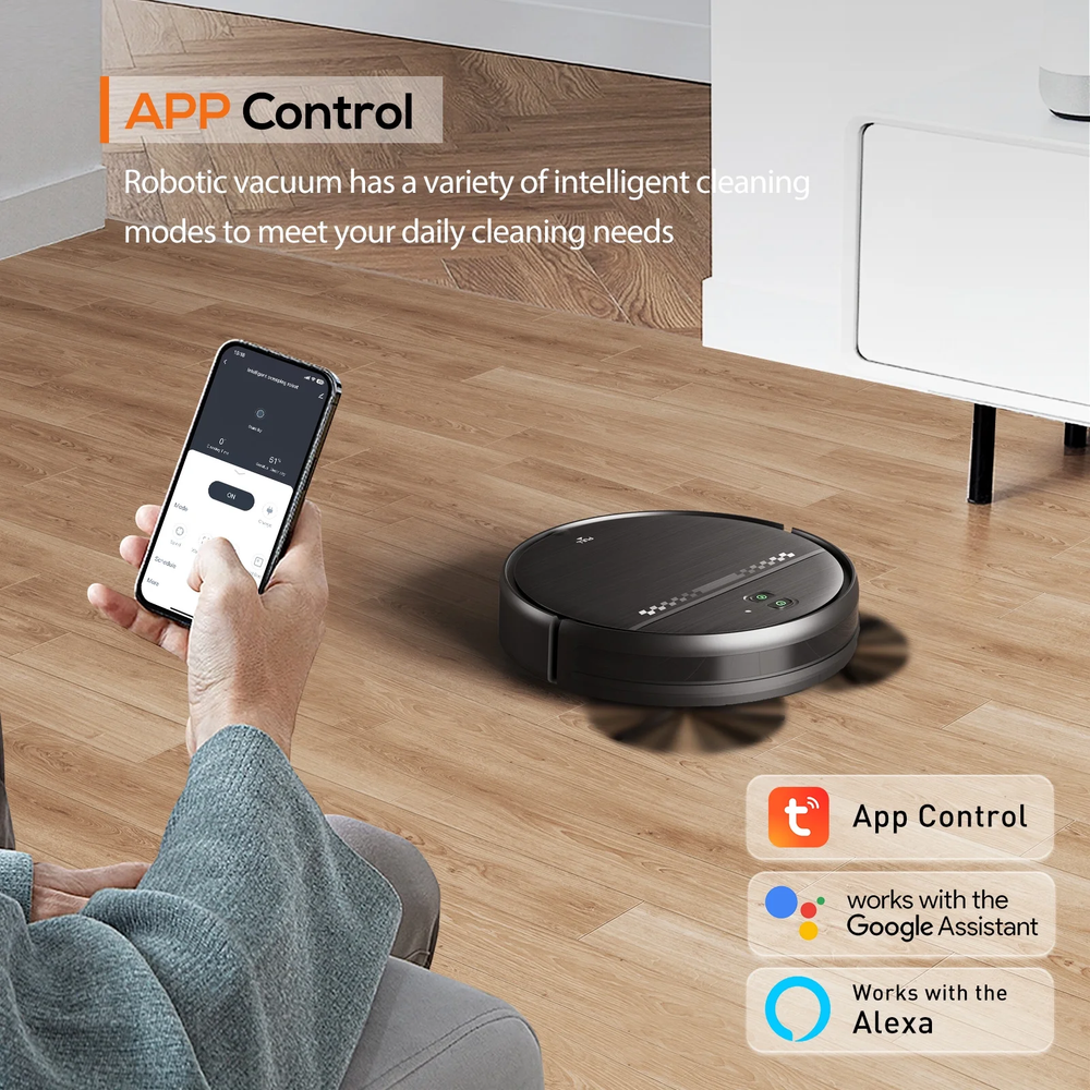 Menu Other Items Feedbacks About Us Contact Us Add To Favorites Robot Vacuum Cleaner & Mop Combo with App Wifi and Remote Control Robotic Vacuums GOOVI Robot Vacuum Cleaner features 4 cleaning modes with a 230 ML water tank to mop the floor. 2500 mAh high-capacity battery provides 100 minutes of long-lasting runtime. You can through voice control with Alexa or Google Assistant to control the robot vacuum route. Are you still using the handheld mop to clean your house daily? Do you still feel distressed about cleaning the pet hair and litter? The GOOVI robot vacuum cleaner and mop will solve these problems, bringing a cozy lifestyle to you. At the same time, this robot vacuum is also a perfect gift for friends and family who value home cleanliness and comfort. ❇️2-in-1 Robot Vacuum: With its dual functionality, this advanced robot vacuum cleaner effortlessly transitions between sweeping and mopping, effectively eliminating pet hair, dust, and crumbs. Equipped with a spacious 200ml dust box and a 230ml water tank, the robot vacuum ensures thorough cleaning of your floors. ❇️Multifunctional Robot Vacuum Cleaner: This intelligent cleaning robot vacuum offers flexible options that can be easily switched between using the remote control or smart app. With modes such as spot cleaning, automatic cleaning, edge cleaning, and Zig-Zag cleaning, our vacuum robot is designed to efficiently clean your home. ❇️Smart App and Voice Control: The compatibility with Alexa and Google Assistant, along with the inclusion of a remote control, provides convenient options for controlling the device. If you have any specific questions about setting up the smart app or voice control features, feel free to ask for detailed guidance. ❇️120 Minutes Run Time & Auto Recharge: Robotic vacuum cleaner with a 120-minute run time and the ability to cover a maximum cleaning area of 1920sqft. The automatic robot vacuum returns to the charging dock when the battery is low or when cleaning is complete. ❇️Anti-Bump and Anti-Fall: Robotic vacuum cleaner including anti-drop sensors and an infrared buffer anti-collision board. It allows the vacuum to clean efficiently without colliding or falling. Additionally, the boost-Intellect technology automatically adjusts the suction power when transitioning from different floor surfaces. 【⚠Notes before buying】: 1. This robot vacuum cleaner can not work on long-tassel carpet. It can work for other colors low low-pile carpet, except black carpet. 2. The robot vacuum with zig-zag cleaning modes, without a mapping function. 【⚠Notes before using】: 1. Please read the manual carefully before using the robot vacuum cleaners and mop for carpet and hard floor 2. The default cleaning path of the robot vacuum and mop combo is random. 3. The mopping and vacuum function is not suitable for the carpet. Please remove the mop holder in advance before cleaning the carpet. Please avoid carpet tassels entwining the wheels of the robotic vacuum cleaner. 4. If you only need to pick up debris, please take off the mop holder; it will have better suction. 5. Please clean the filter regularly and keep it dry after washing it, which will improve suction. WIFI Connected and Voice control Support Alexa and Google Assistant 2300 Pa Powerful Suction Zig-Zag Cleaning Mode Vacuum And Mopping Simultaneously 120 Mins Working Time Spot Cleaning for a Fixed aArea Adopting Anti-Drop Sensor Infrared Sensor Avoid The Collision 3 Years Warranty Brand: GOOVI Robot Vacuum Robotic vacuum cleaner Robot Vacuum and mop Robot vacuum mop combo Robot Vacuum cleaner and mop Item Specification Battery life 120 min Appliance type Robot Vacuum & Mops Filter type HEPA Method of operation Random, Outer to Inner Perimeter, Straight Path Weight 7.8 lb Has written warranty No Features Bluetooth Enabled, Smart Technology, Wi-Fi Compatible Recommended surface Hardwood, Carpet Surface cleaning machine feature Auto-Docking, Mops Floor, Motion Sensing, Pet Hair Removal, Edge Cleaner, Scheduling, Spot Clean Capability Cleaning path 8 in Accessories 2*Side Brushes, 1*Adapter, 1*Remote Control, 1*Cleaning Brushes, 1*Charging Base Height 2.9 in Air watts 44 W Dimensions Shipping Returns Additional Info Product Dimensions: . Weight: 7.8 lb