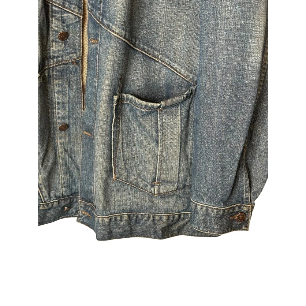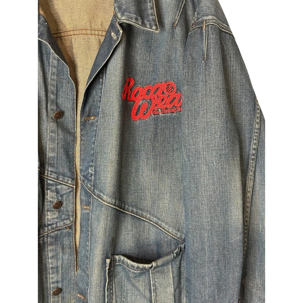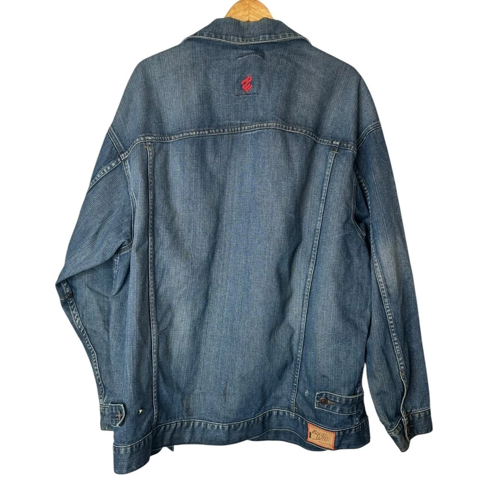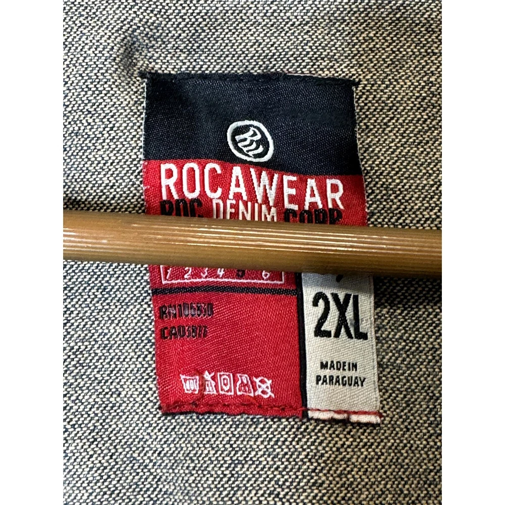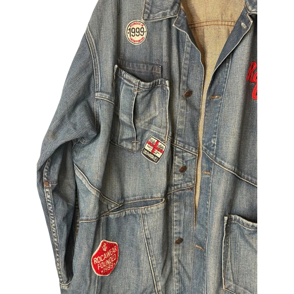Rocawear Mens Denim Patchwork Jacket Size 2XL **Small Tiny Hole in the back of jacket in the bottom** 31" Lenght 24" Sleeve lenght 28" Pit to Pit