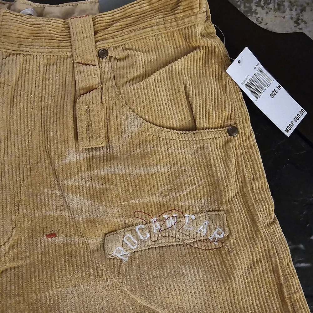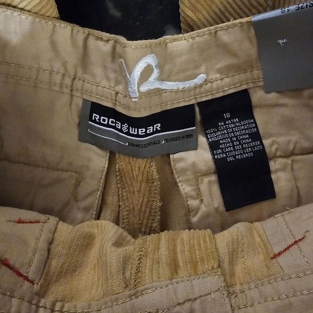 Color: Beige Waist Size: 30 in Season: Spring, Winter, Fall Style: Cargo Inseam: 29 in Vintage: Yes Closure: Zip Type: Pants Performance/Activity: Skateboarding Material: 100% Cotton Fabric Type: Corduroy Occasion: Casual Size: 18 Theme: Y2K, Skater Fit: Relaxed Department: Boys Brand: Rocawear Features: Pockets, Ribbed