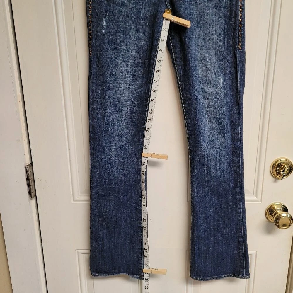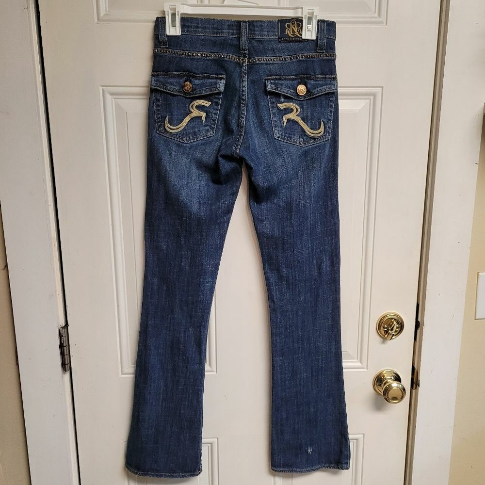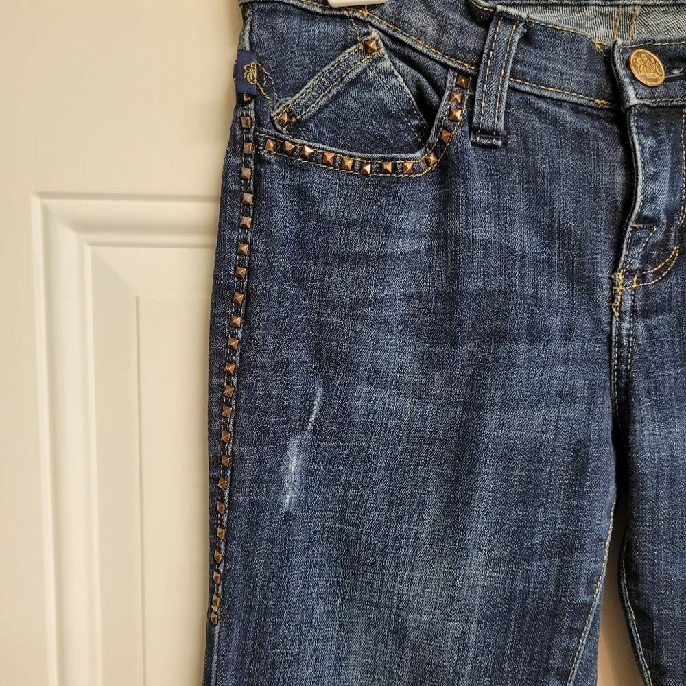 Rock and republic lightly distressed studded bootcut jeans. Buttoned flap pockets in back with gold embroidered pocket design Imperfection ( 1 small hole in the lower back leg pictured above) Size: 2