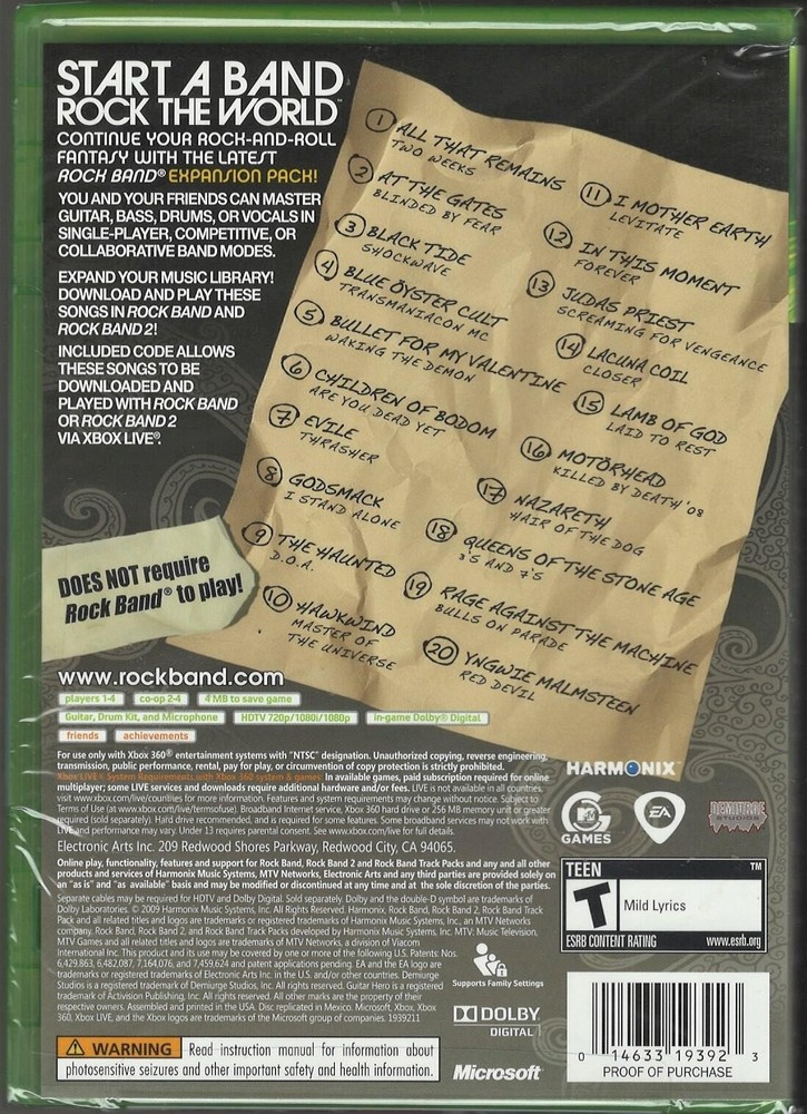 UPC: 0014633193923 Country of Origin: United States Video Game Series: Rock Band Series fnb20-106: T (Teen 13+) taxCode-electronics: 89998 Age Group-Multi: Adult nrfSizeCode: 00000 Genre: Action & Adventure legalWarnings: None origin: Imported Rating: T-Teen warranty: N Game Name: Rock Band: Metal Track Pack nrfColorCode: 960 Publisher: MTV Games Brand: Electronic Arts facet:Video Game Type: Video Games fnb20-103: Xbox 360 Platform: Microsoft Xbox 360 Electronics Type-Electronics: Video Games gtin13: 0014633193923 fnb20-100: Physical