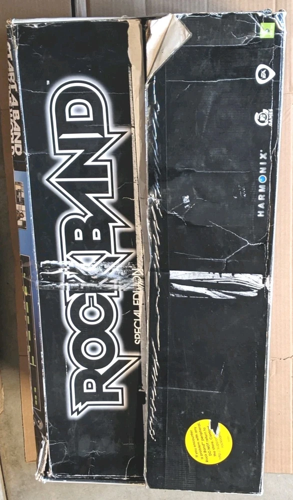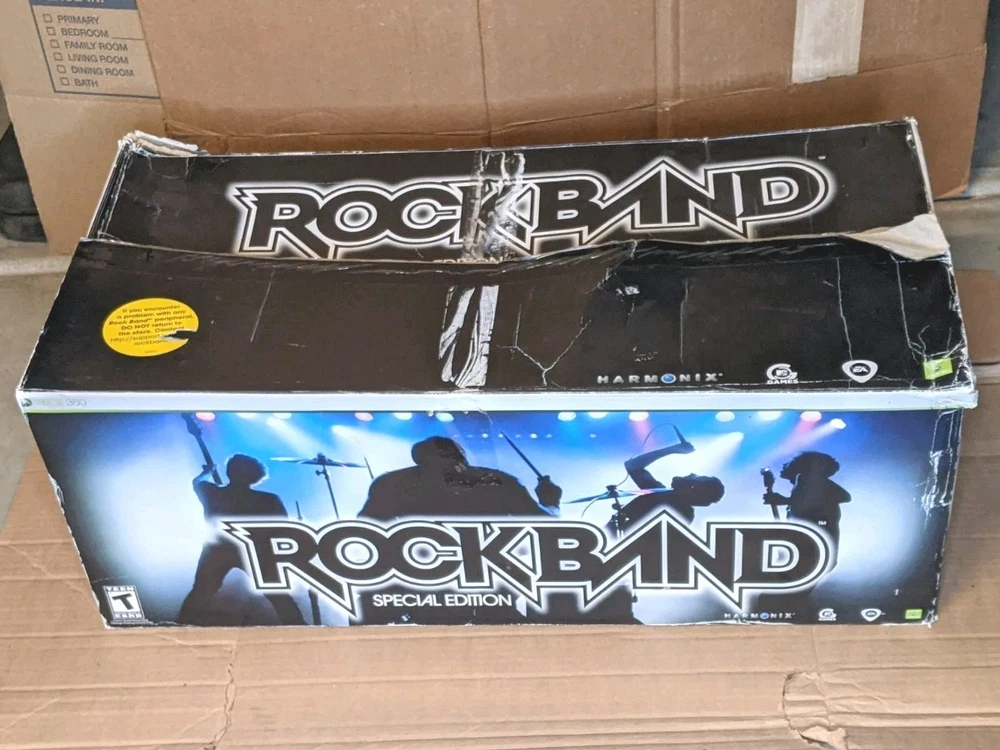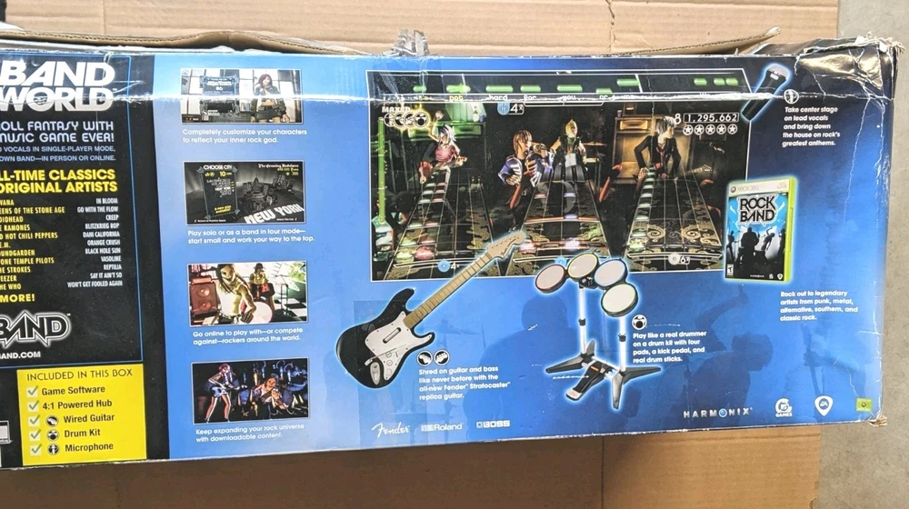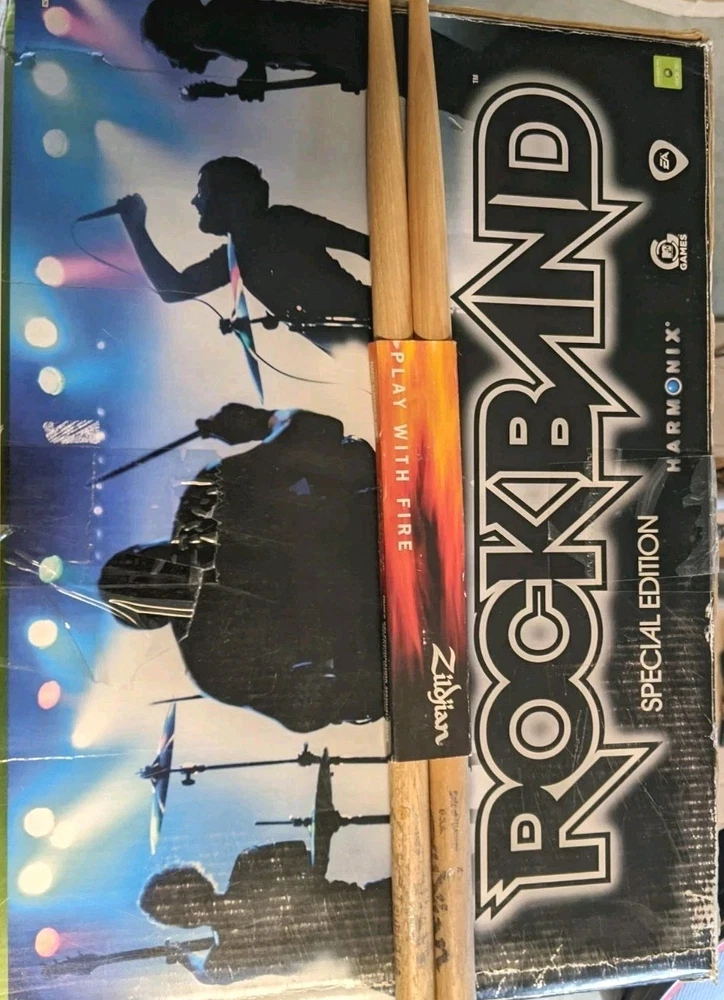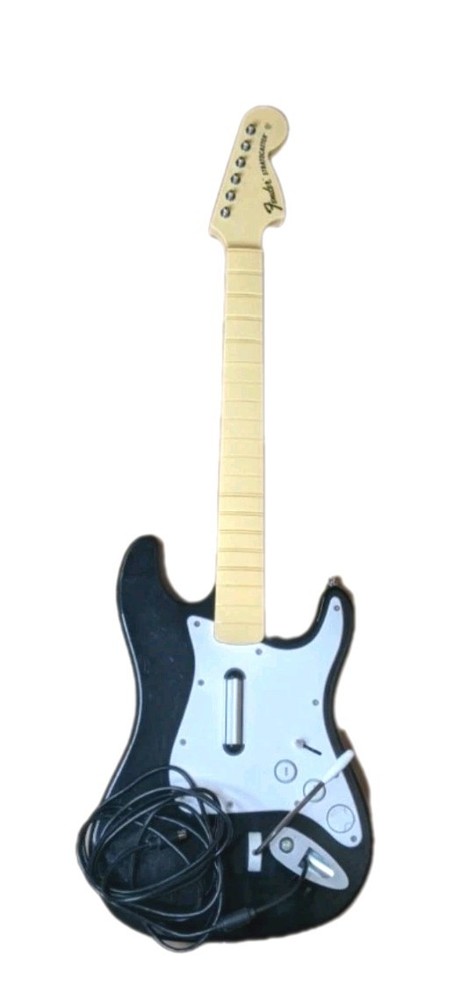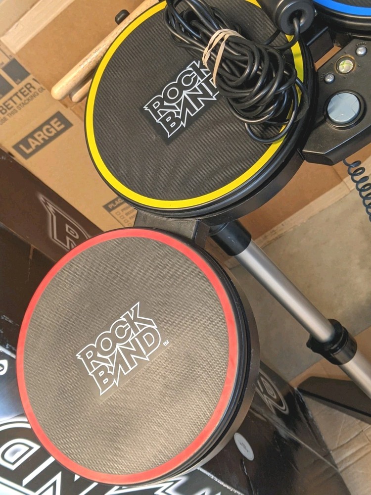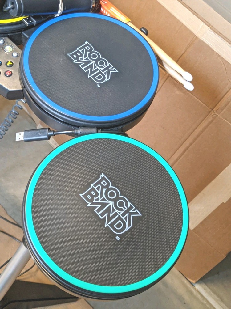 Rock Band Special Edition Drum Set Bundle with Wired Fender Guitar, Microphone, and Game – Tested and Working Everything included in this bundle has been tested and works properly. This is a great starter kit for Rock Band players looking to play drums, guitar, and vocals. Included: • Rock Band drum set with stand • Kick pedal • Wired Fender Stratocaster guitar controller • Microphone • Rock Band game disc • Drumsticks • Original drum box (box shows wear from storage) • Cables shown in photos Condition: All items are in good pre-owned condition with normal cosmetic wear from use. Please review all photos carefully for exact condition. The drum set functions properly and registers all inputs. The guitar has been tested and works as expected. The microphone is also tested and working. Notes: This bundle does not include additional expansion cymbals. Only the items shown in the photos are included. Shipping: The drum set will be carefully packed to ensure safe delivery. If you have any questions feel free to ask!