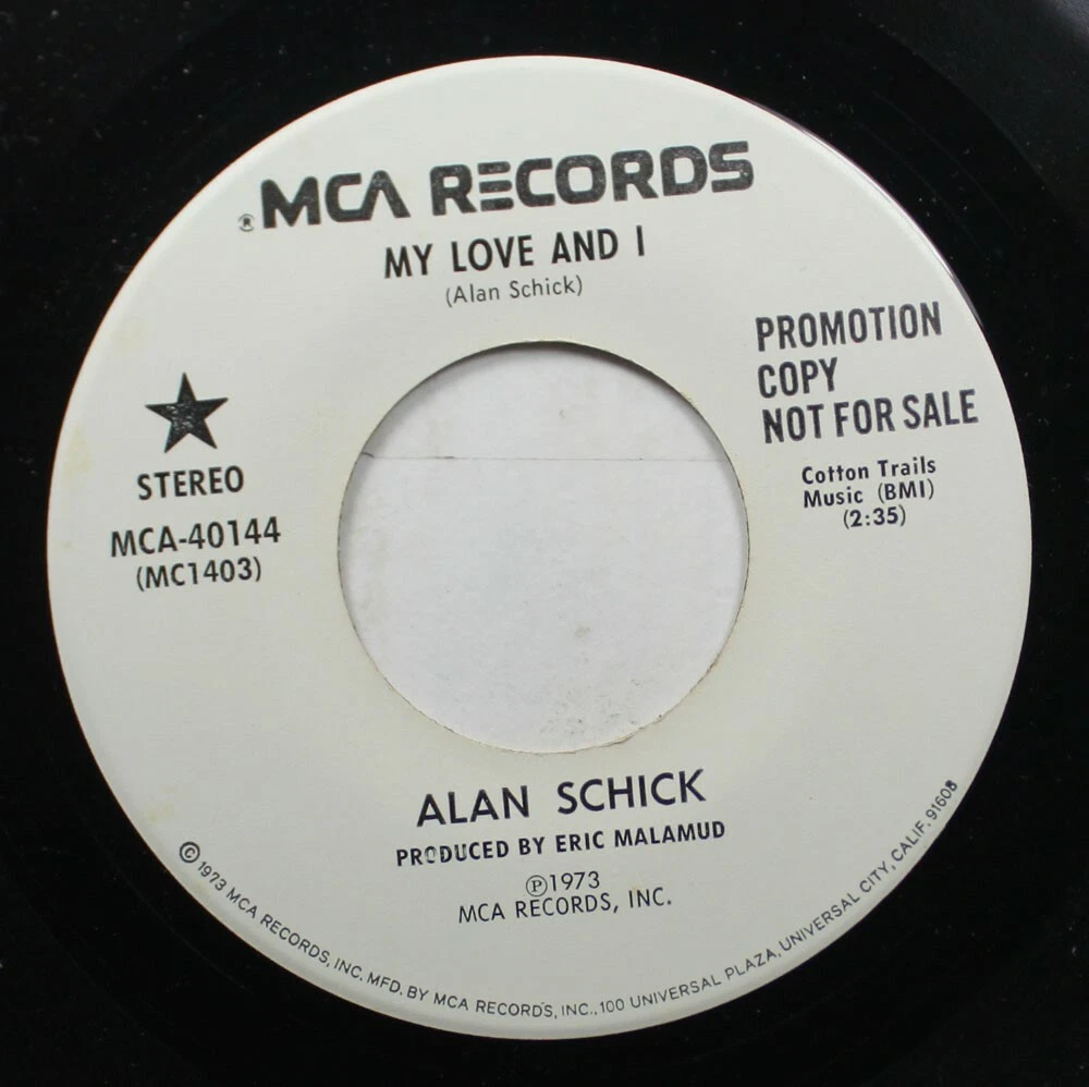 Artist : Alan Schick Songs : My Love and I / My Love and I Condition of Vinyl: VG++ to NM! Condition of Label/Sleeve: See picture Shipping Costs Location Shipping Cost for 1st Item Cost Per Additional Items U.S. $5 for 45 Free! for LP 45-FREE! LP- Free! Canada $12 for 45 $19 for LP 45-$3 each LP-$6 each Worldwide $12 for 45 $19 for LP 45-$3 each LP $6 each We gladly ship anywhere in the world! Please let us know if you have any questions...Thanks! Powered by SixBit's eCommerce Solution