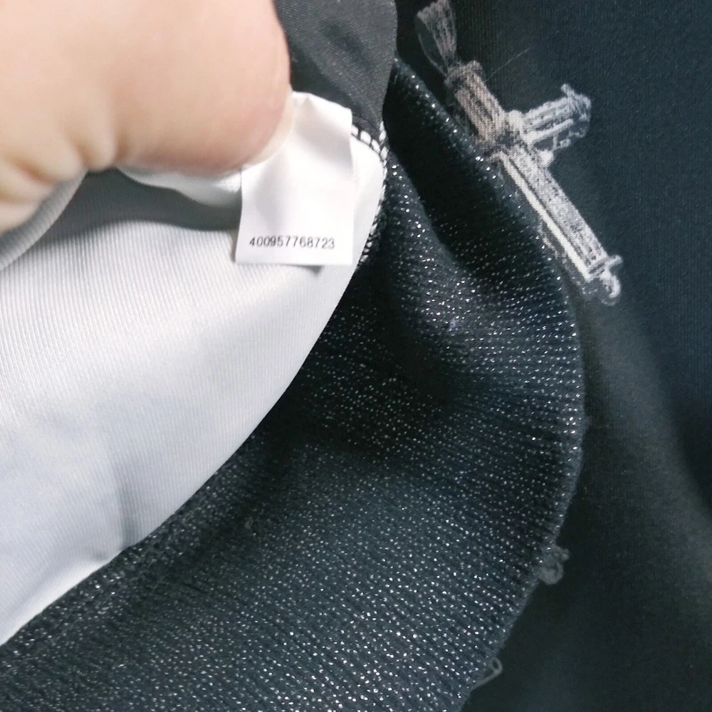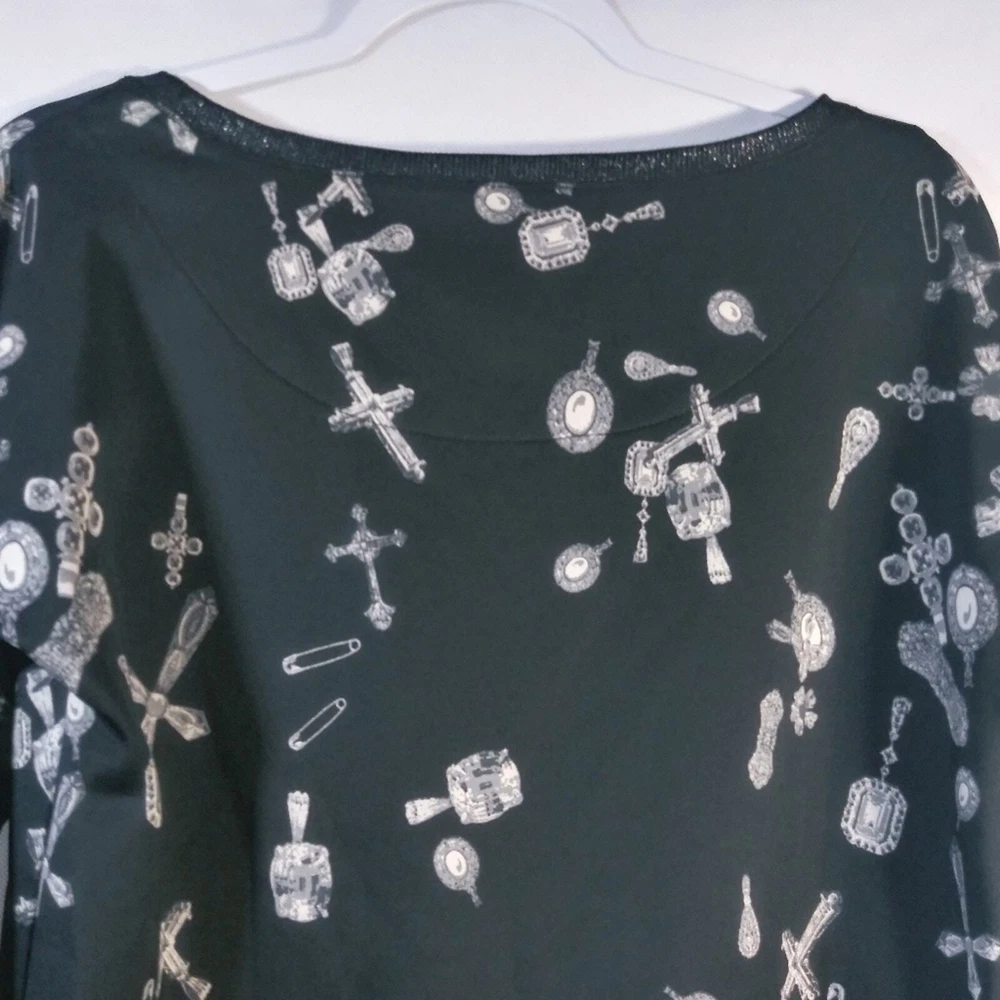 Rock & Republic Black Jewels and Crosses Patterned Gothic Grunge Sweatshirt Size M Long sleeve sweatshirt jewels and cross pattern throughout black glitter hem on cuffs and waist band boat neck soft and comfy over sized gently worn approximate measurements pit to pit 21" length 24"