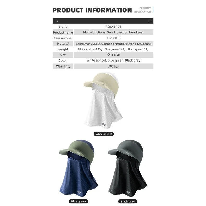 Product Feature: 1.Multi-functional:it's not only headgear,cap,but also face mask,scarf,full face cover,protect your head,face and neck,and can be worn with a Helmet; 2.Sun Protection: UPF50+, UVA<5%,full face design effectively blocks ultraviolet rays; 3.Cooling:soft fabric+mesh design, Cool and comfortable to wear; 4.Adjustable:one size, fits all peolple, easy and effortless to wear; 5.Removeable:detachable face mask for versatile use in different situations; 6.Washable:high color fastness, easy to care for in daily use.