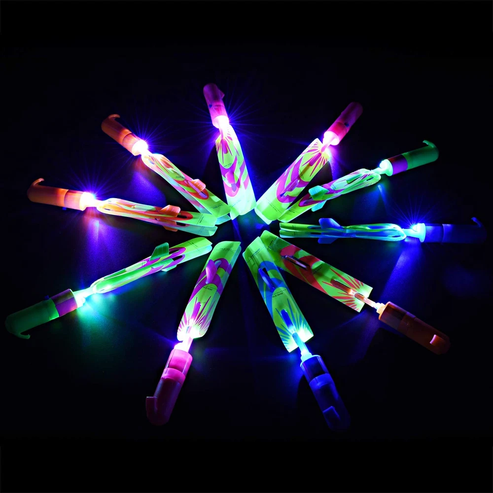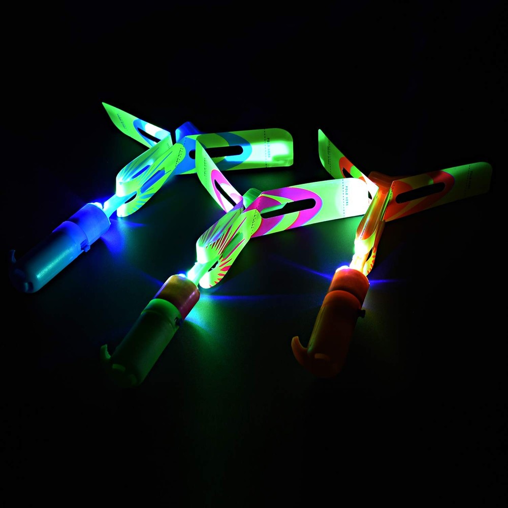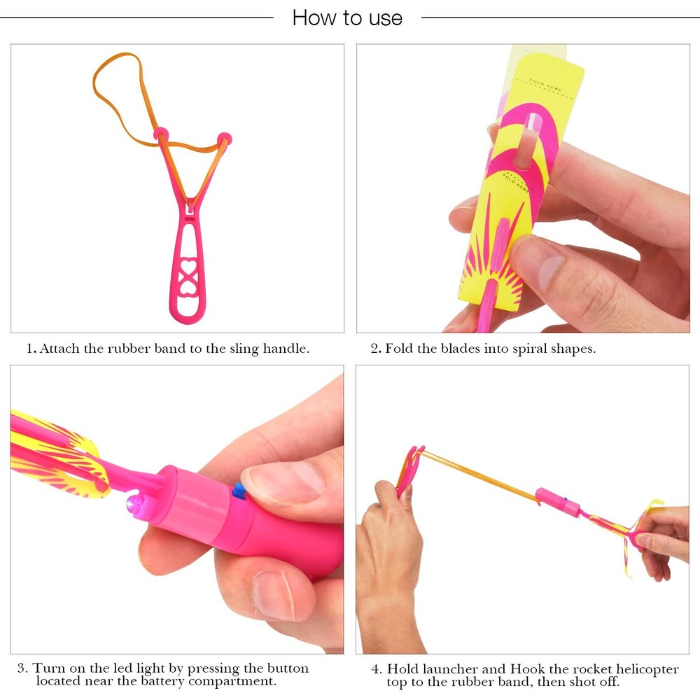 LED Toys with Slingshot 34 PCS - Amazing Slingshot LED Fun for All Ages It is exciting to see these helicopters illuminate the night sky. These LED toys will bring a beaming smile to the face of everyone. Launches like a -flies like a helicopter! - 12 Toy Slingshot in 4 colors - 12 frisbee with LED light - 12 Extra replaceable wings - All Batteries are INCLUDED - Colors: neon green, neon orange, blue and neon pink Durable Launchers Toy Slingshot These for kids and family are made of high-quality ABS Highly Visible Design The slingshot are highly visible. These slingshot have the potential to launch up to 160 feet in the air and still be seen. Their high intensity LED light ensures that they can be seen up to a whopping half miles away. Easy to Use Fold the wings into spiral shapes Turn on the led light by pressing the button near the battery compartment Hold launcher and Hook the helicopter top to the rubber band, then launch to the sky When done, they fall slowly down for a safe and secure landing. Perfect for any Occasions It looks great at night so you can have hours of fun with family in your courtyard. Great party favors - also perfect for being a present for kids on Christmas, Birthday Party, etc. Fun for All Ages 6+ All of your friends and family will be able to enjoy toy. Note Do not launch led flying at people, animals, or breakable objects. Please check rubber bands before using. It’s better to use them at night or in clear weather. 【Product Package 】12 Pcs Slingshot LED Helicopters + 12 Pcs LED glowing Helicopters copters+10 extra wings, 34 pieces in total. And the batteries are included! It is made of high-quality waterproof PVC plastic, best used at night. 【Perfect Design】Compact, sturdy, and light - you take it anyplace with only 7.7 inches diameter of slingshot LED helicopters. It can be caught in the smallest of hands. Colorful slingshot helicopters - each has an LED light, and you can play on any occasion. 【Great Gifts for Kids】DIY can improve their practical skills and intelligence, this is the best toy of the year for all ages, even your youngest kids will love chasing. It will bring more fun to your family and children, these are a lot of fun for all ages. 【Caution】Do not launch LED rocket flying toy slingshots at people, animals, or breakable objects, pls inspect rubber bands before use for any signs of damage. 【Application Occasions】It looks great at night, you can have hours of fun with the family in your courtyard. It is suitable for school games between students, birthday parties, and also for giving Birthday and Christmas gifts to kids. They create a stunning atmosphere, its flash brings lots of joy to all of us!