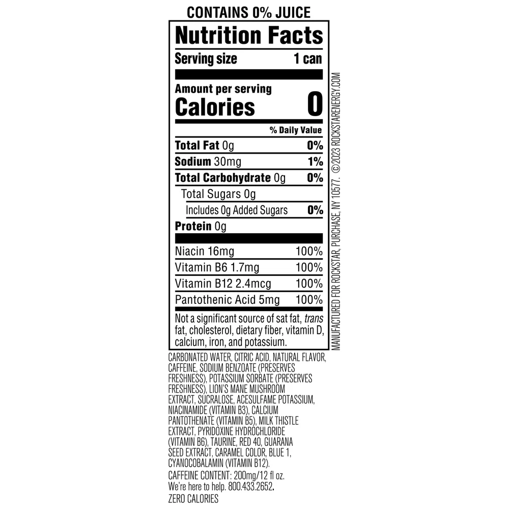 Product details Rockstar Focus Energy Drink is made with lion’s mane for energy & mental boost. Rockstar Focus Energy Drink has zero calories and zero sugar, all flavor, no guilt. With 200mg Caffeine per can, Rockstar Focus Energy Drink is your energy & mental boost companion, so you can be in the moment. Boss your day with sustained energy & focus. Rockstar Energy Drink is designed for those who lead active lifestyles - from Athletes to Rock Stars. Includes (12) 12 oz cans of Rockstar Focus Energy Drink Mixed Berry flavor, energy and mental boost* with Lion’s Maine, Zero Sugar, Zero Calories Lion’s Mane: popular mushroom meets OG Rockstar Energy Zero Sugar and Zero Calories: Rockstar Focus Energy Drink is all flavor, no guilt 200mg Caffeine: Rockstar Focus Energy Drink is your energy & mental boost companion so you can be in the moment Rockstar Focus Energy Drink: Boss your day. Sustained energy & focus. 12oz 12pk Zero Sugar Zero Calories