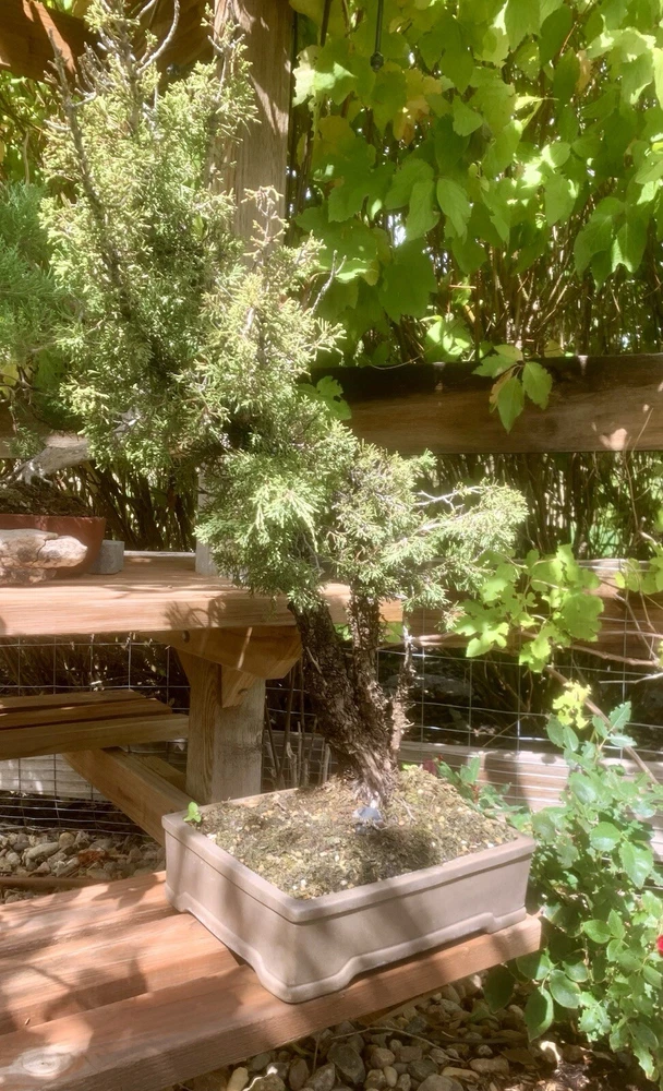Rocky Mountain Juniper Bonsai Nebari 3 inches Height 32 inches Out of collection 1 year+ Triple trunk, one of which is deadwood Chinese ceramic Buyer pays shipping of their choice Starting bid $200, BIN $400