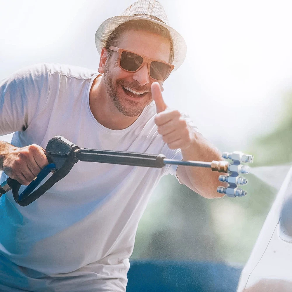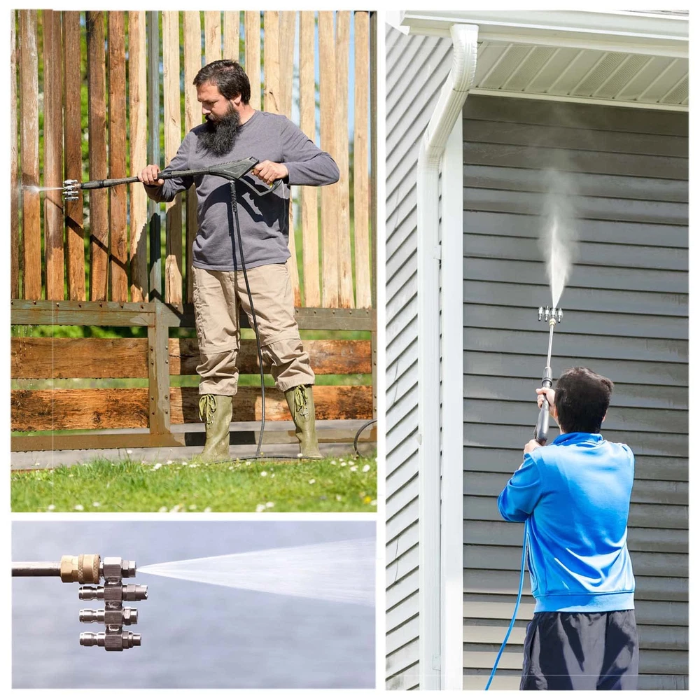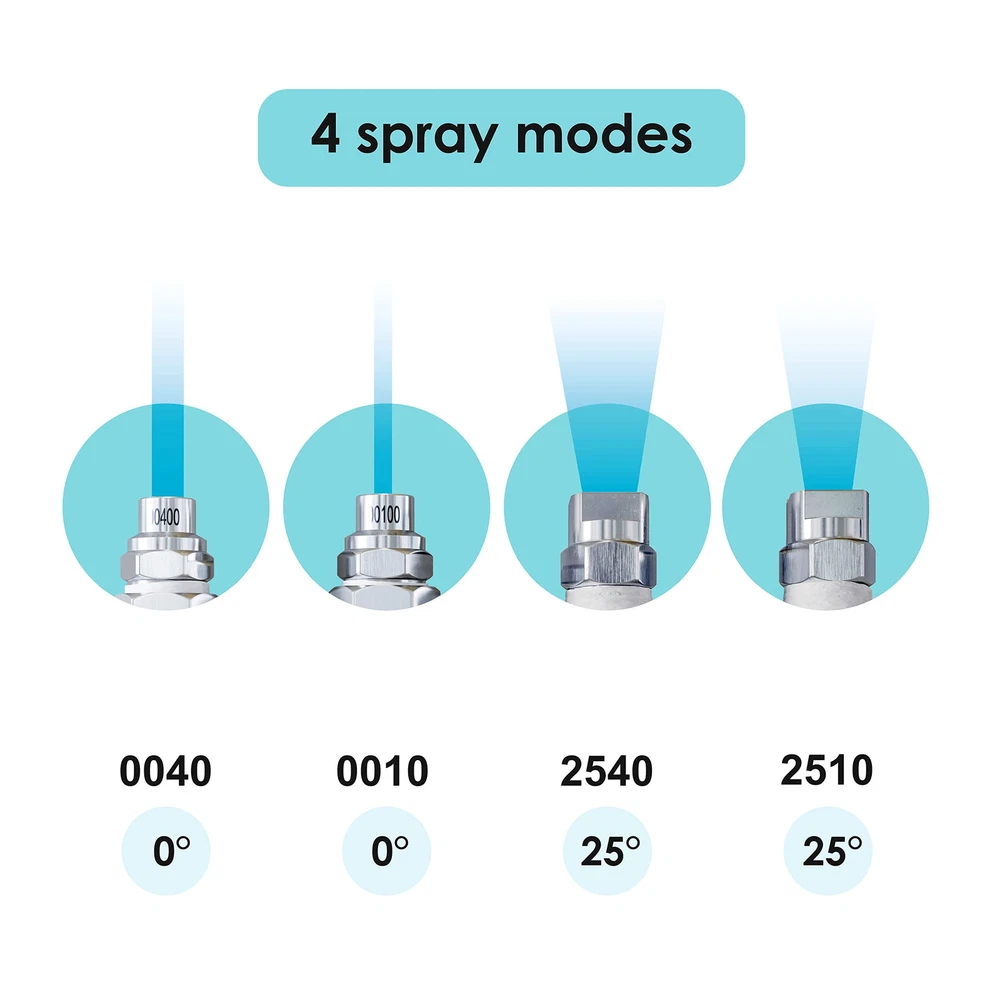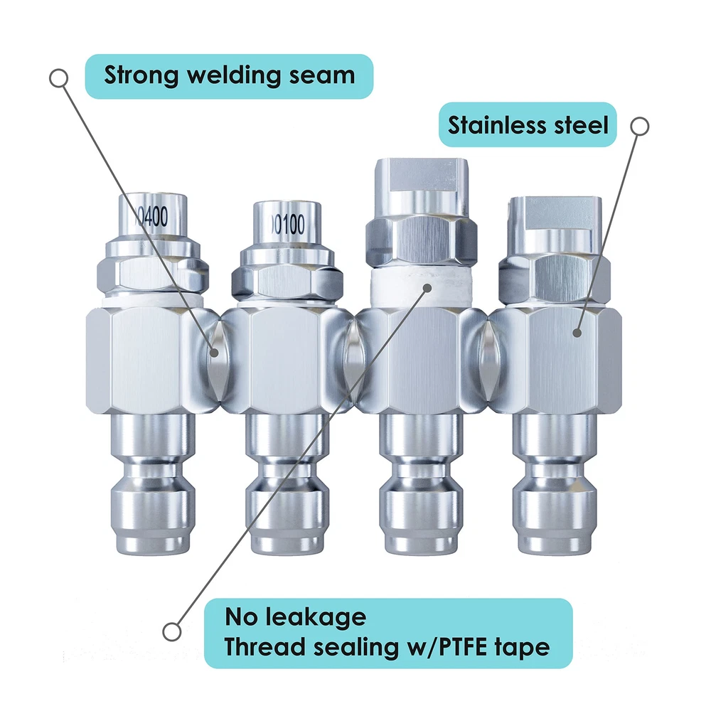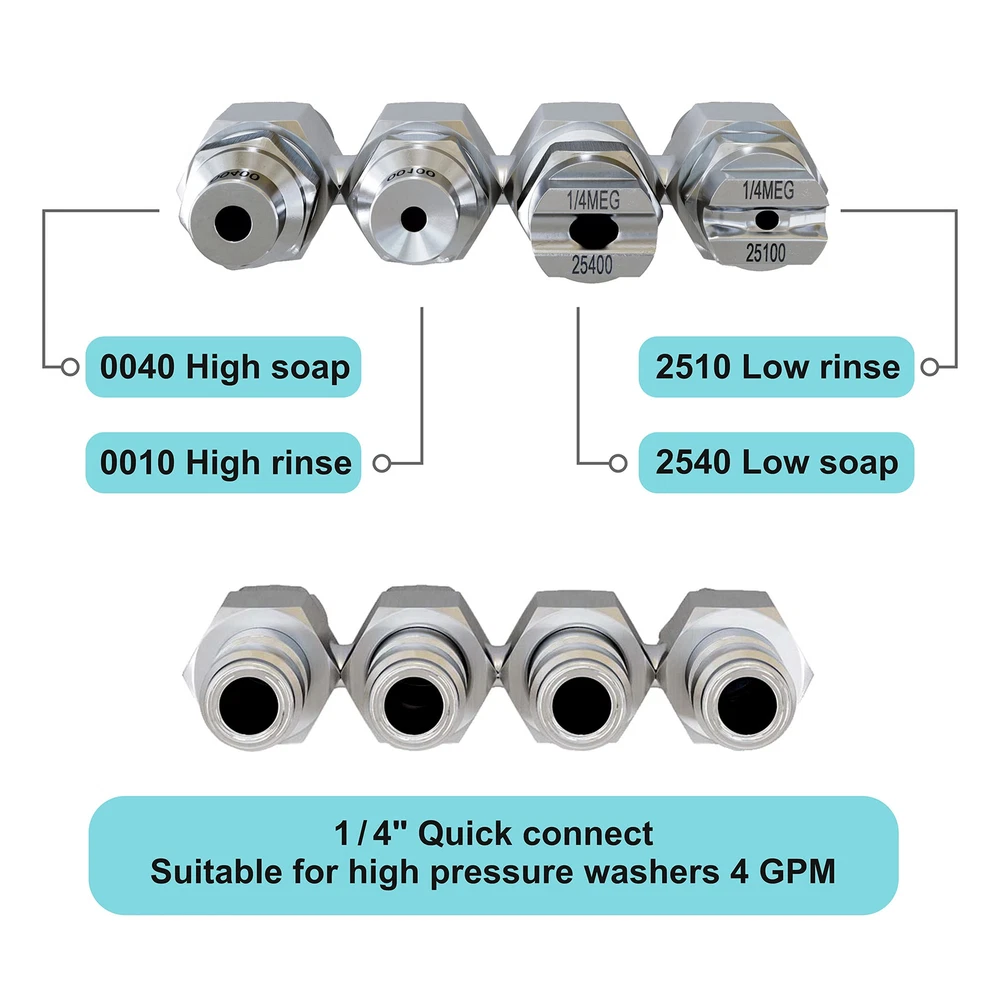 Quality: Pressure washer nozzle tips are made of high quality stainless steel, which guarantees durability and corrosion resistance. The rod kit has a welding seam, which improves wear resistance and strength. Functionality: 4 way rod nozzle is with 2-4 GPM pressure washers, fits standard 1/4" quick connect fittings. Save time and effort when cleaning surfaces and hard-to-reach places. Wide Application: Our pressure washer tips set can be used in the courtyards, car, truck, high walls and other surfaces, it is resistant to chemicals. You can easily change the mode by simply changing the nozzle. Washing modes: Nozzles 0010, 0040 - spray angle 0, direct and powerful jet; Nozzles 2540, 2510 - spray angle 25 degrees, suitable for delicate cleaning of surfaces. With our pressure washer attachments you get 4 different jet streams and you can use the right nozzle depending on your needs. Easy to Use: To prevent leakage and improve fit, sealing PTFE tape was applied to each nozzle. Enjoy saving time and effort with our pressure washer nozzles.