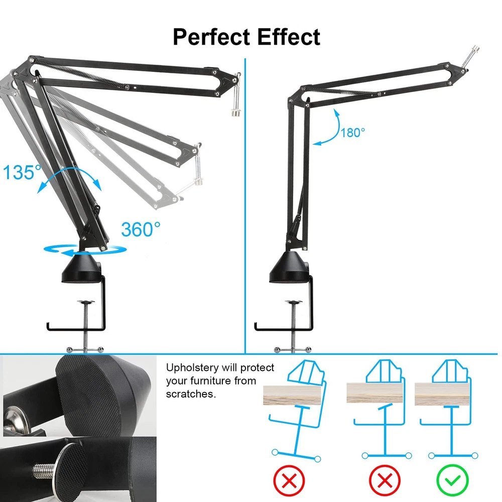If you are looking for a professional, broadcast quality microphone boom like you might see in a radio station control room 's heavy duty suspension boom scissor arm stand is your best choice. Mic stand for Rode Podmic is built with firm metal, double-braced arms and strong spring and can be used for different conditions. Professional Mic Cover Protect your favorite mic: Protect your microphone from smell of drool, surplus spit, accumulation of saliva. Easy & quick mount / unmount: Screw rotating clamp with scratch-proof gripper and rubber mat offers you a friendly and easy mounting and demounting. This foam wind screen is maded of high-density foam which can protect your mic from dust damage. Picks your original sound only. Say goodbye to complicated post-production. Professinal Pop Filter: Banish the dreaded hissing and lisping sounds that come when pronouncing the letter "S" and blocks those ugly "plosives" that follows "B" and "P". It is a great item for singers, streamers and actors Cable Management Sleeve Cable Sleeve can organized your mic power cord, ensure the cord doesn't get tangled. Looks more beautiful and neat. Simply gather your cables with boom arm's pipe. Force open the end of the cable sleeve and lay your wires and pipe inside. The two cable steeve should be installed in the two positions of the mic stand. Hiding cables with these wraps has never been so easy, your cable mess is now organized. Package included: 1 x Microphone stand 1 x Pop filter for microphone rodepod mic 1 x Foam windscreen for microphone rodepod mic 1 x Mic stand adapter 1 x Upgraded Table Mounting Clamp 2 x Cable organizer 3 x Velcro cable [All-in-one Combo]: Package includes all the items for studio recording and live sound: 1 x heavy duty microphone stand, 1 x pop filter, 1 x windscreen, 2 x cable organizer, 3 x velcro cable ties for Rode Podmic microphone. [Mic Stand]: Bold-spring protects microphone from shaking, suddenly dropping and making noise. Suspension boom scissor arm can keep the microphone in any position you want. [Mic Cover]: Professional foam windscreen with double layered screen pop filters filter out all unwanted background noises. [Compatibility]: The reach on this mic boom is 27"/70cm from base to mount, max desktop thickness: 2.7"/7cm, max load:1.6kg. Convenient to use in any scene. [Excellent Details]: Microphone table clip with soft cushion protect your furniture, 3/8"-16 female to 5/8"-27 male screw thread adapter never worry about installation problems.