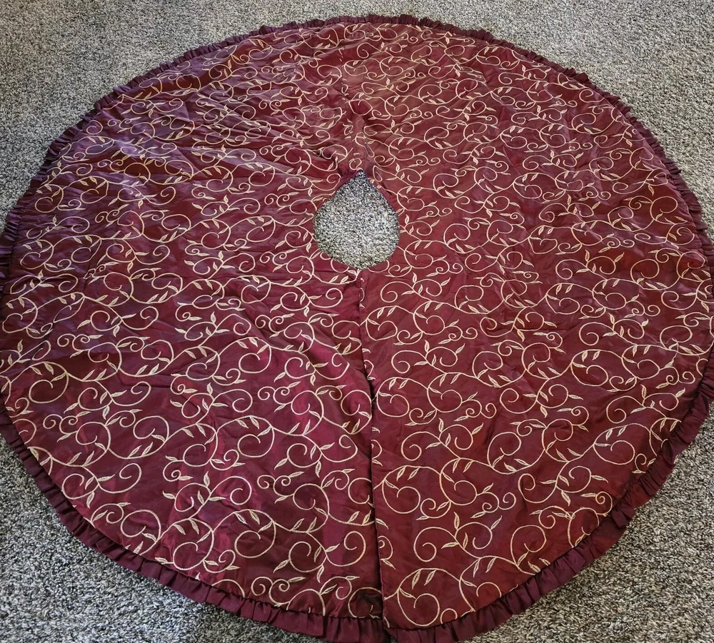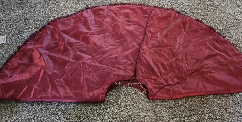 Rodeo Home Red W/ Gold Stitching Round Christmas Tree Skirt Holiday Decoration Eyelet Hooks A few small snags, good condition