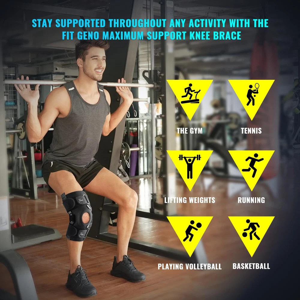 Rodillera con bisagra para desgarro de menisco soporte de rodilla ajustable Product Description About this item MAXIMUM SUPPORT & PAIN RELIEF: Fit Geno’s ReActive+ hinged knee brace with side stabilizers is highly recommended ACL knee braces for men and women to relieve any kind of knee pain. The hinges plus side stabilizers offer maximum support to improve (medial and lateral) stability and helps recover from meniscus tear, runner's knee, sprains, athletic compression, sport-related injuries, mild osteoarthritis, PCL/MCL/LCL and other related ligament problems. SPORTS MEDICINE SPECIALISTS RECOMMENDED: Our hinged knee brace will effectively maintain your joint stability. This adjustable knee brace fits your leg perfectly and protects the knee from potential injuries without sacrificing the mobility! The dual aluminum hinges can be easily removed from the integrated sleeves while the side stabilizers still provide enough support as needed. More flexible than other knee protectors to provide customized support in any situation!!! HEAVY DUTY, MEDICAL-GRADE, LATEX-FREE MATERIAL: Introduced with advanced aluminum, the hinges and stabilizer are super lightweight while durable. The medical grade Patella Gel Pad which is soft, elastic and shockproof is sewn at the patella to prevent patella injury. The breathable material provides compression and soothing warmth yet provides a better airflow to prevent skin irritation thus making it an ideal method for recovery and pain relief! DOUBLE ANTI-SLIP, OPEN PATELLA & BACK DESIGN: 2 Medical grade non-slip silicone strips and 4 adjustable straps to avoid the knee brace sliding down during fierce exercise. Our excellent MCL knee brace is made with open patella and back with cushion to help lessen the stress/pressure to the knee. It also ensures proper alignment for the kneecap and stabilizes the knee while the open-back is designed to ensure optimum comfort and avoids bunching for all-day relief!