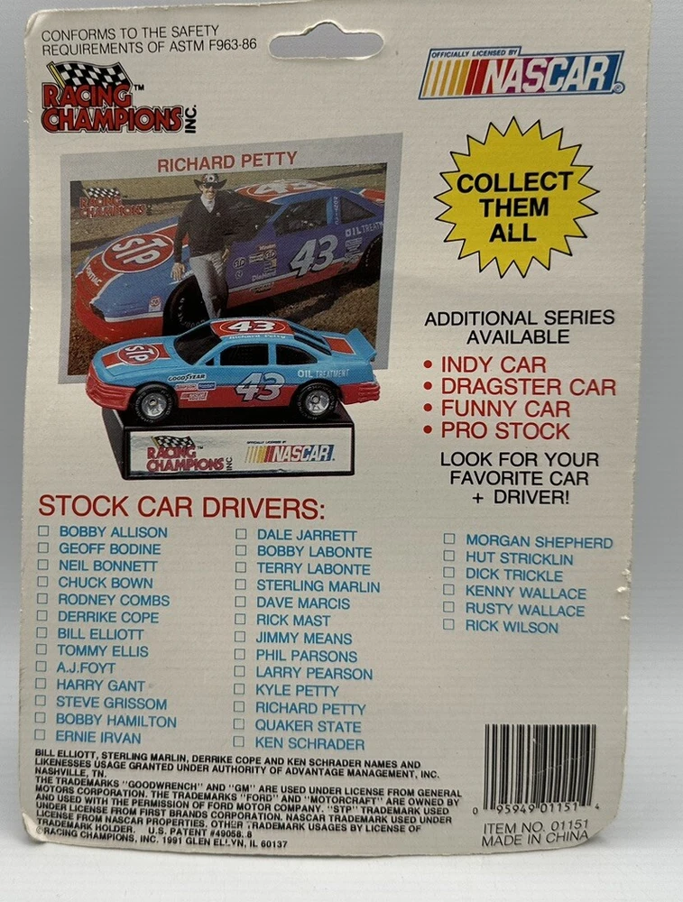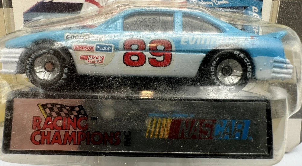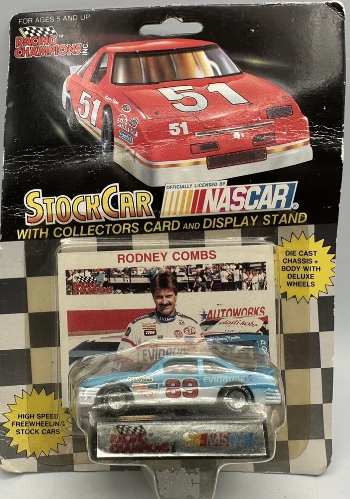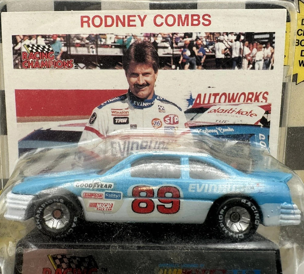 This Racing Champions 1:64 model depicts Rodney Combs' #89 NASCAR racecar, complete with a display stand for easy showcasing. The multi-color diecast car features the Evinrude theme and is perfect for avid NASCAR fans, especially those who follow the Daytona race series. The vehicle type is a NASCAR racecar and the driver is Rodney Combs. The scale is 1:64, making it a collectible item that is great for display. The brand is Racing Champions and the model is labeled as Racing Champions 1:64. The color is multi-color and the material is diecast. This toy car is perfect for fans of the Cars character family and those who love sport and touring cars.