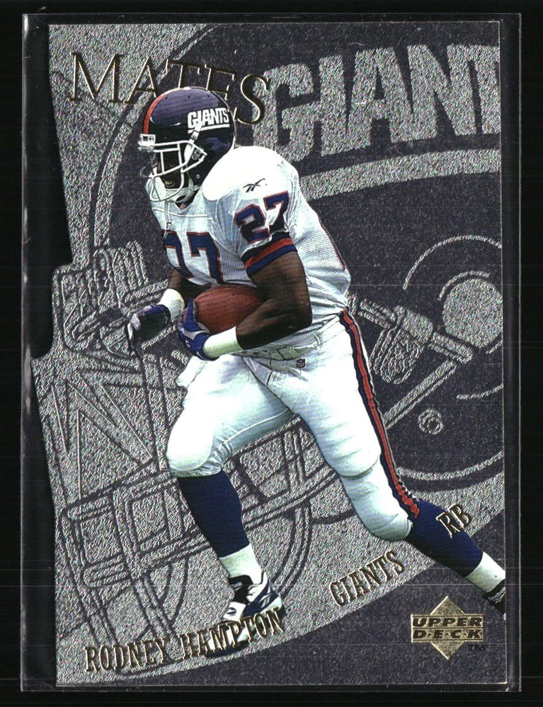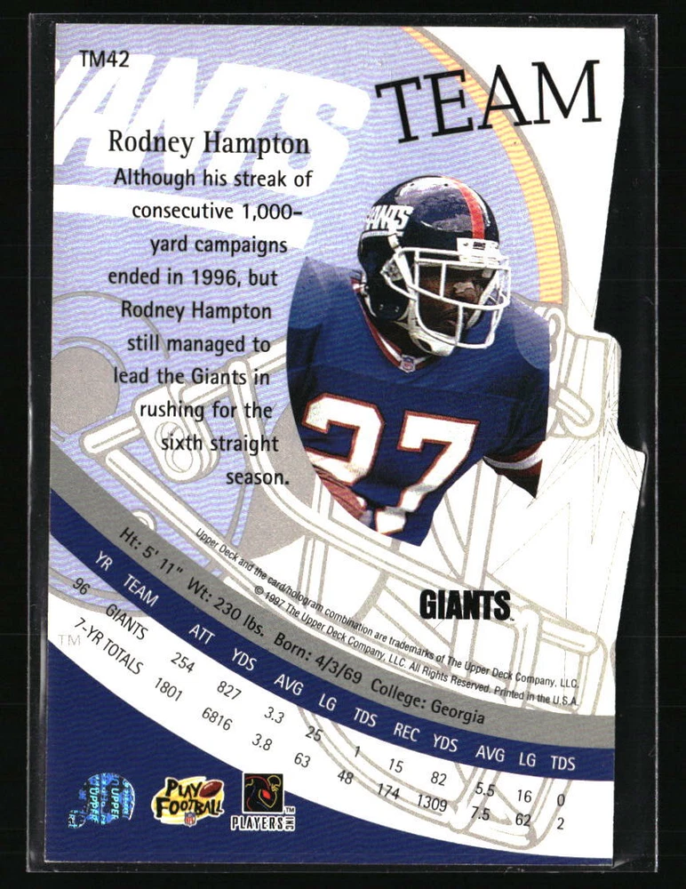 Year Manufactured: 1997 Manufacturer: Upper Deck League: NFL Player/Athlete: Rodney Hampton Graded: No Parallel/Variety: Team Mates Team: New York Giants Autographed: No Type: Sports Trading Card Sport: Football Set: Upper Deck Season: 1997 Card Number: TM42